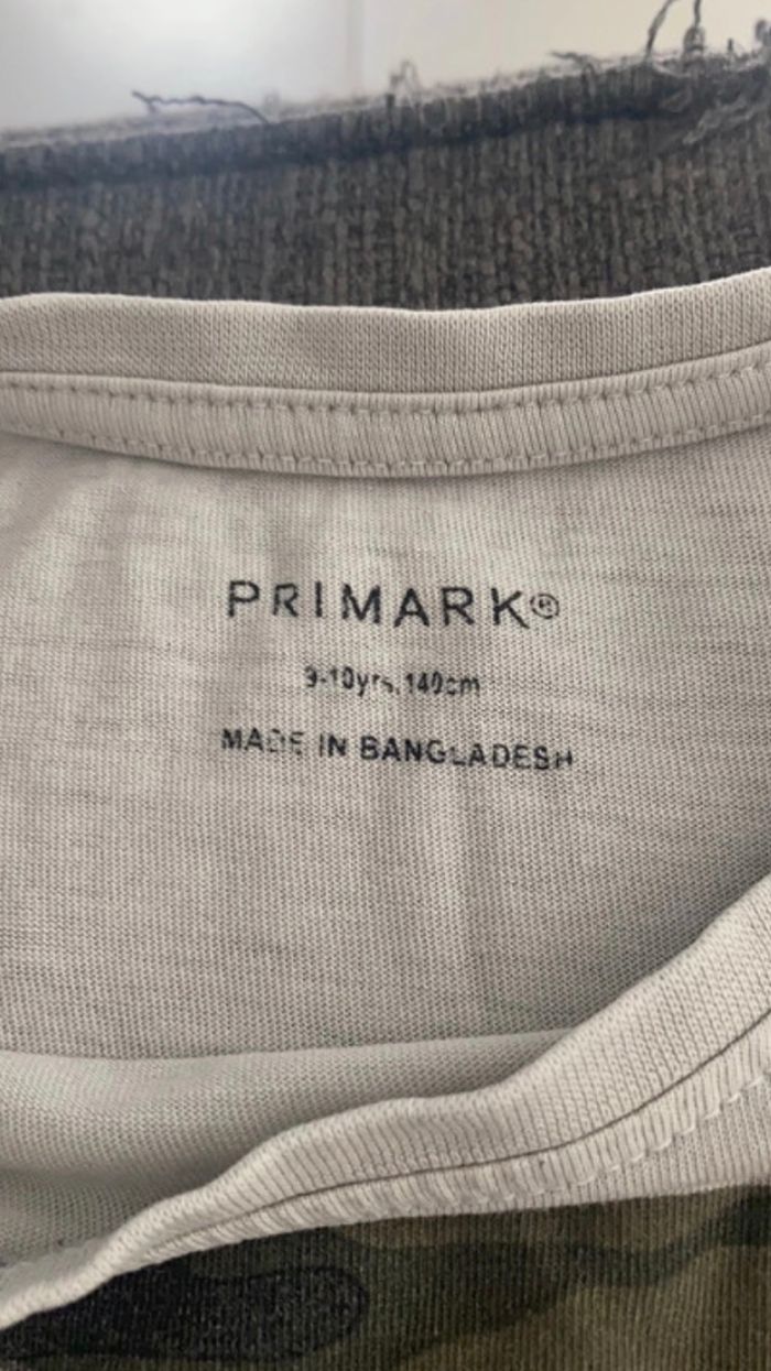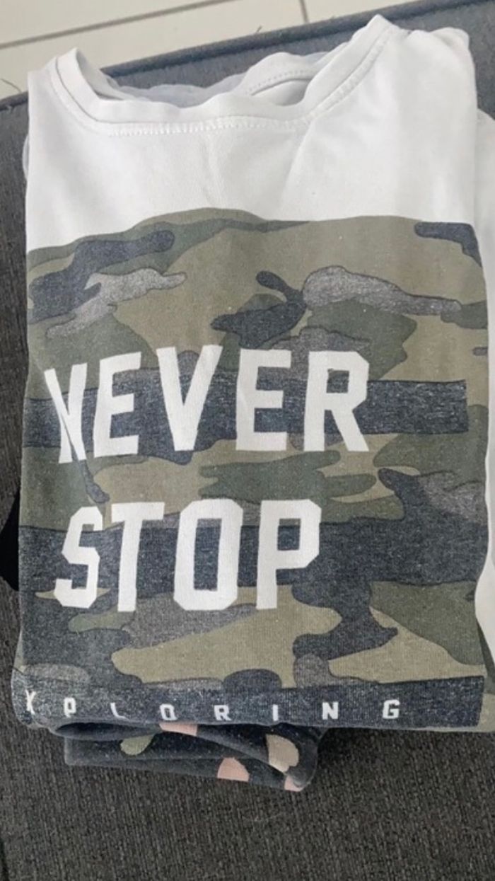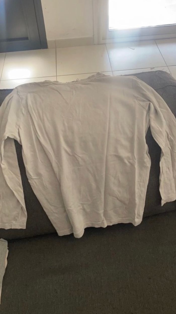 T-shirt manches longues blanc garçon avec inscription sur fond type militaire. Taille 9-10 ans. Bon état.