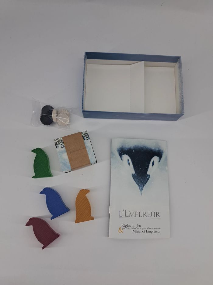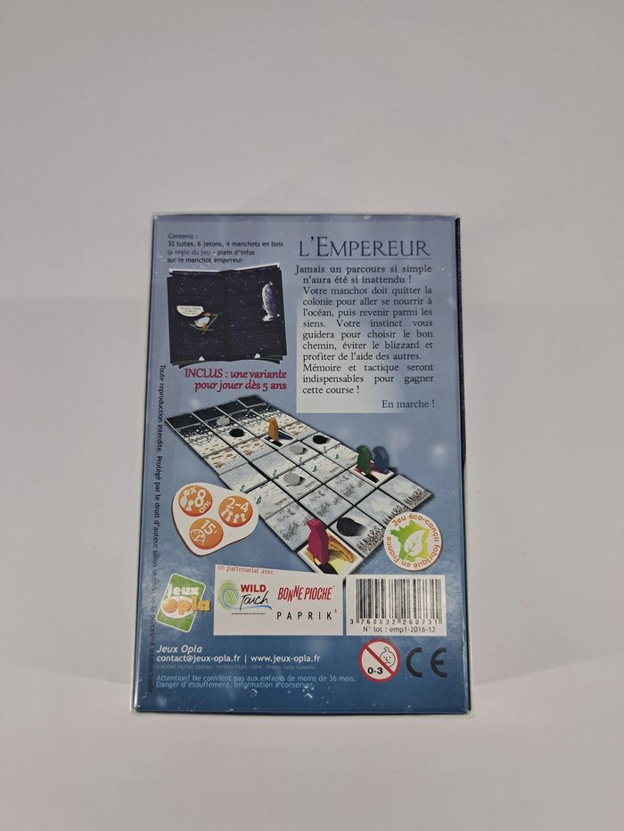 Nombres de joueurs : 2-4 joueurs Temps : 15 minutes Âge : 8 ans Jamais un parcours à priori sans encombres n’aura été autant inattendu ! Dans le jeu L'Empereur, votre manchot doit quitter la colonie pour aller se nourrir à l’océan, puis revenir à la colonie. Votre instinct vous guidera pour choisir le bon chemin, éviter le blizzard et profiter de l’aide des autres. Mémoire et tactique seront indispensables pour gagner cette course ! Jeu neuf Marque : jeux opala Valeur neuf 17 euros