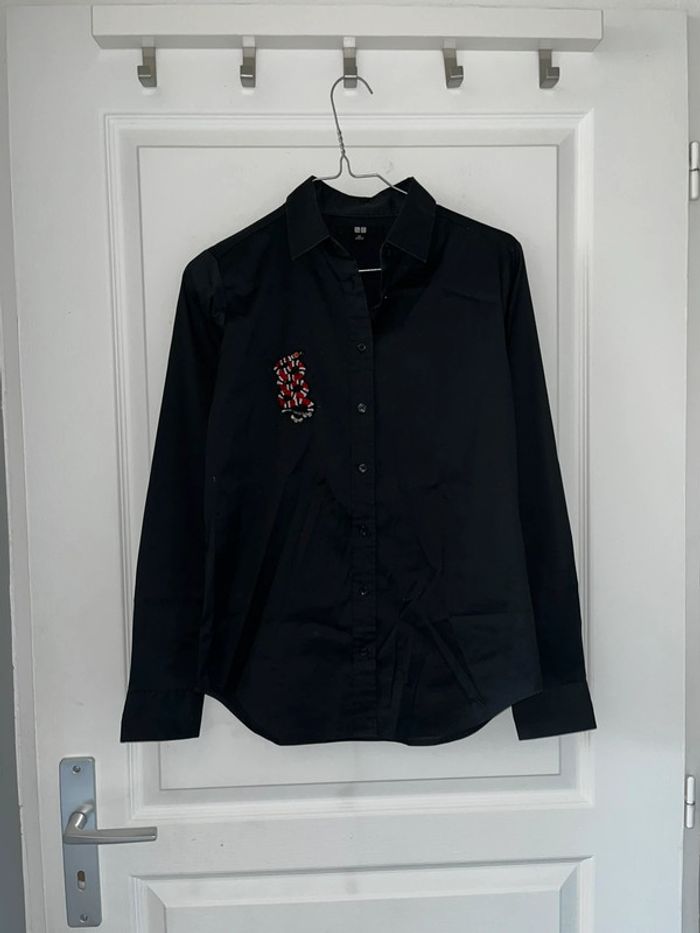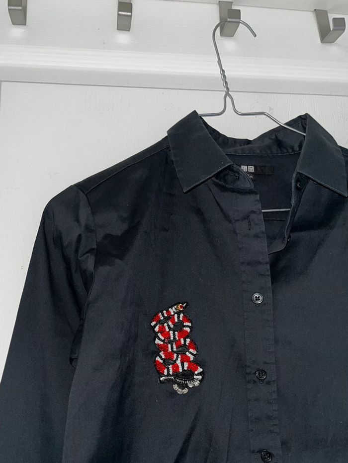 Chemise noire logo serpent rouge, Uniqlo Taille XS En parfait état #chemisenoire #chemiseserpent #chemise #chemiseuniqlo #uniqlo #chemisefemme