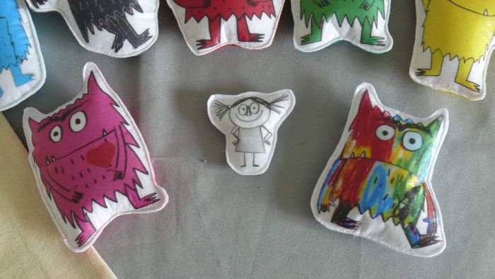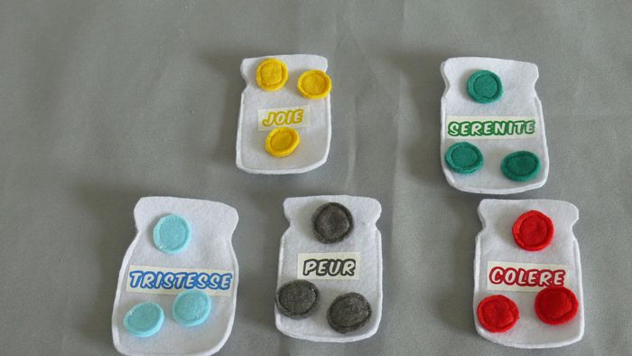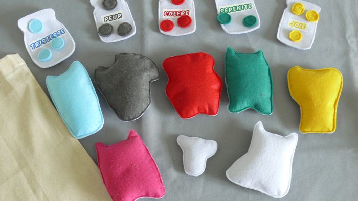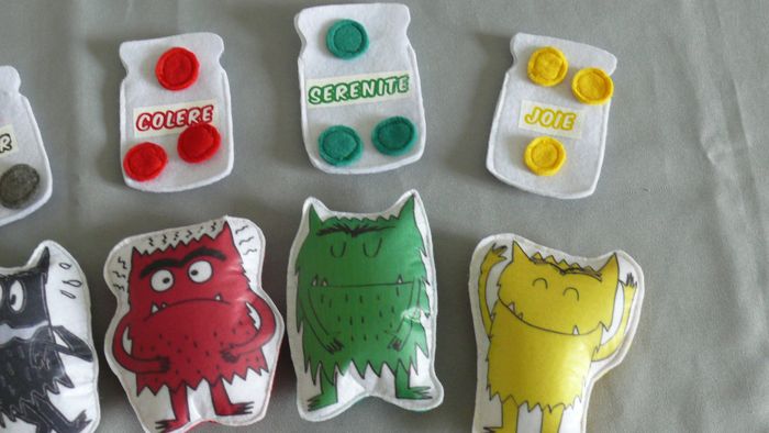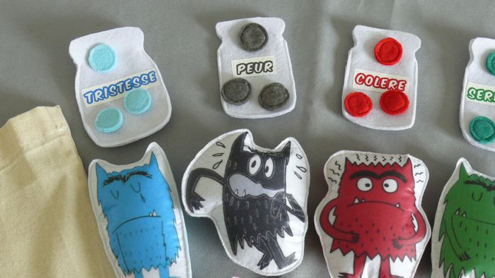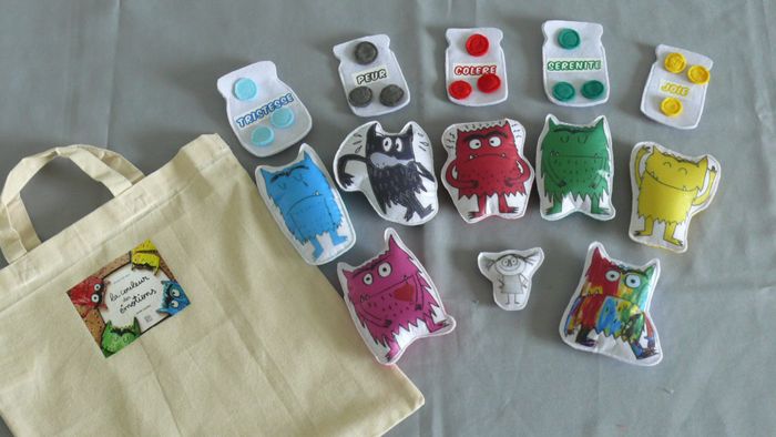 Contient : - Les monstres (10/12 cm de haut) et la petite fille (6 cm de haut) rembourrés sur feutrine blanche à l'avant et feutrine colorée à l'arrière suivant les émotions - 5 bocaux en feutrine blanche sérigraphiés (8/9 cm de haut) qui s'ouvrent - Des pastilles de feutrine ( 3 de chaque émotions) pouvant se glisser dans les bocaux - Un tote bag sérigraphié Envoi en relay Matériel éducatif et pédagogique, à utiliser sous surveillance