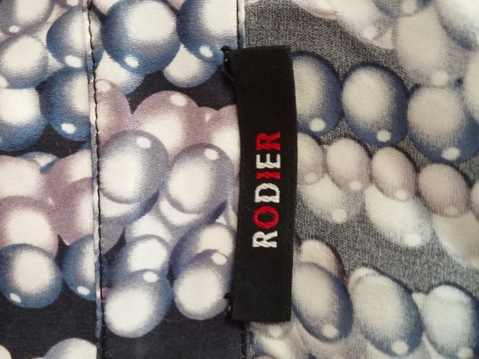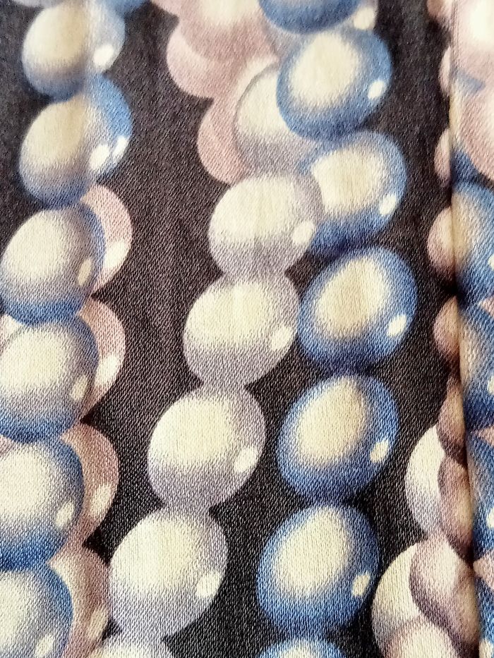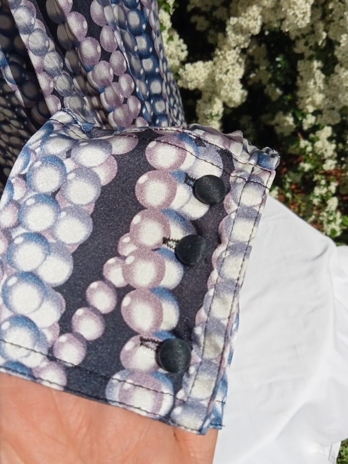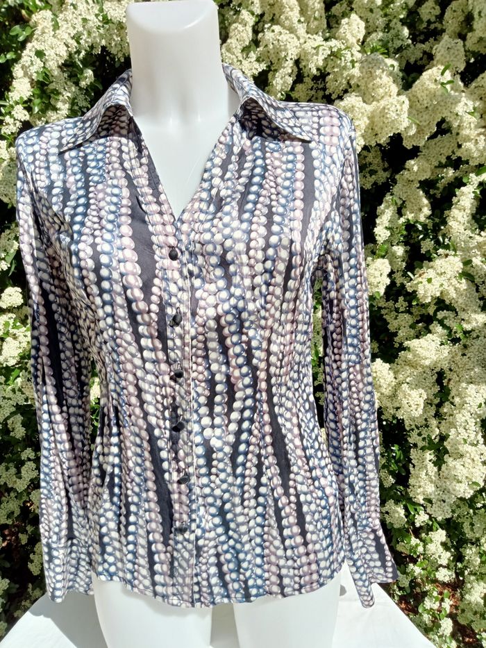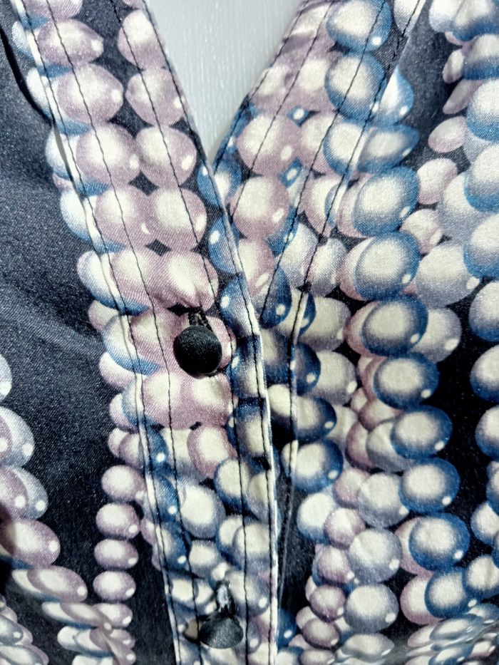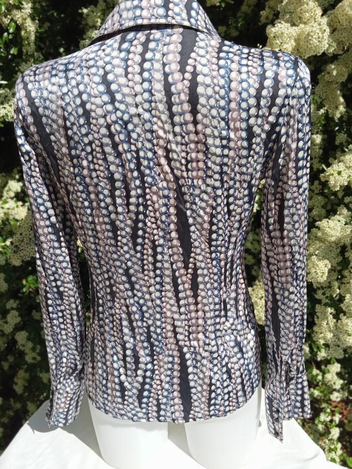 Chemisier en soie les coutures en elasthane donnent un côté très confortable en accompagnant les mouvements sans tirer, impression bulles bleu et argenté, les boutons sont noirs et en soie. En parfait état. aisselles 44 cm épaules 41 cm.