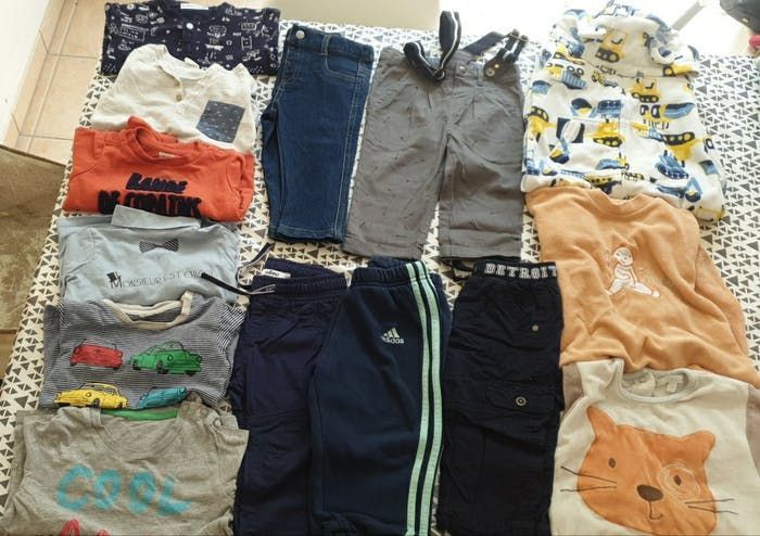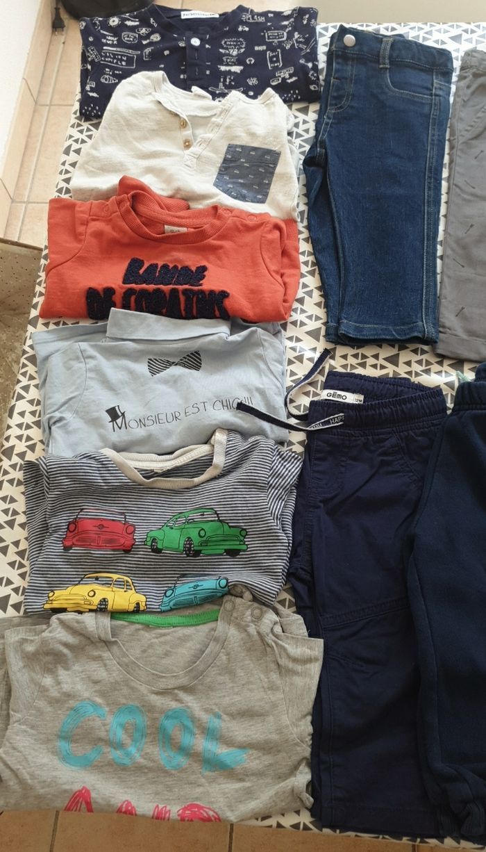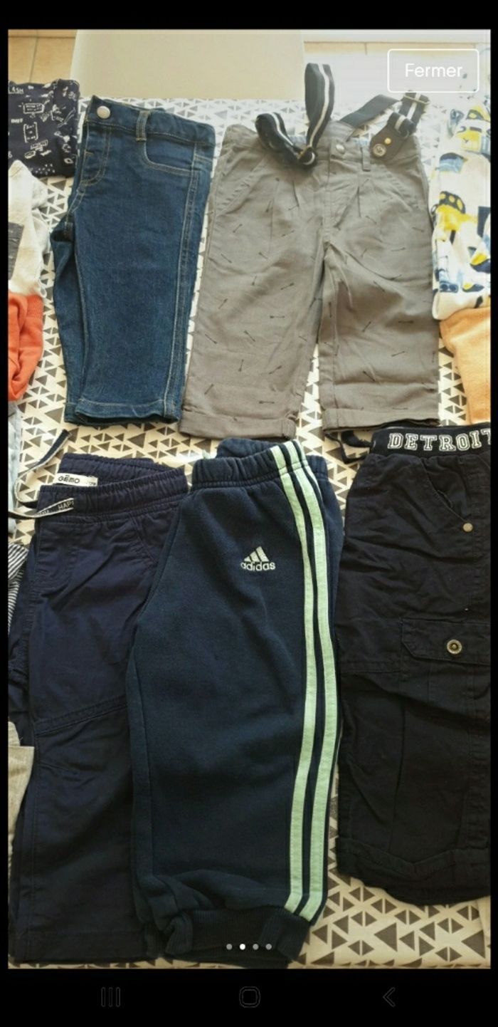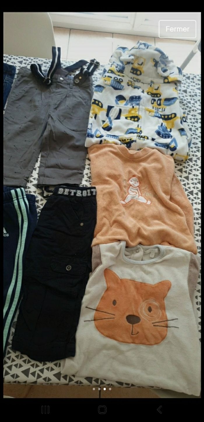 Lot bébé 12/18mois 6 hauts dont 1 manche courte 5 pantalons 3 pyjamas dont 1 avec fermeture a l'avant Bon état