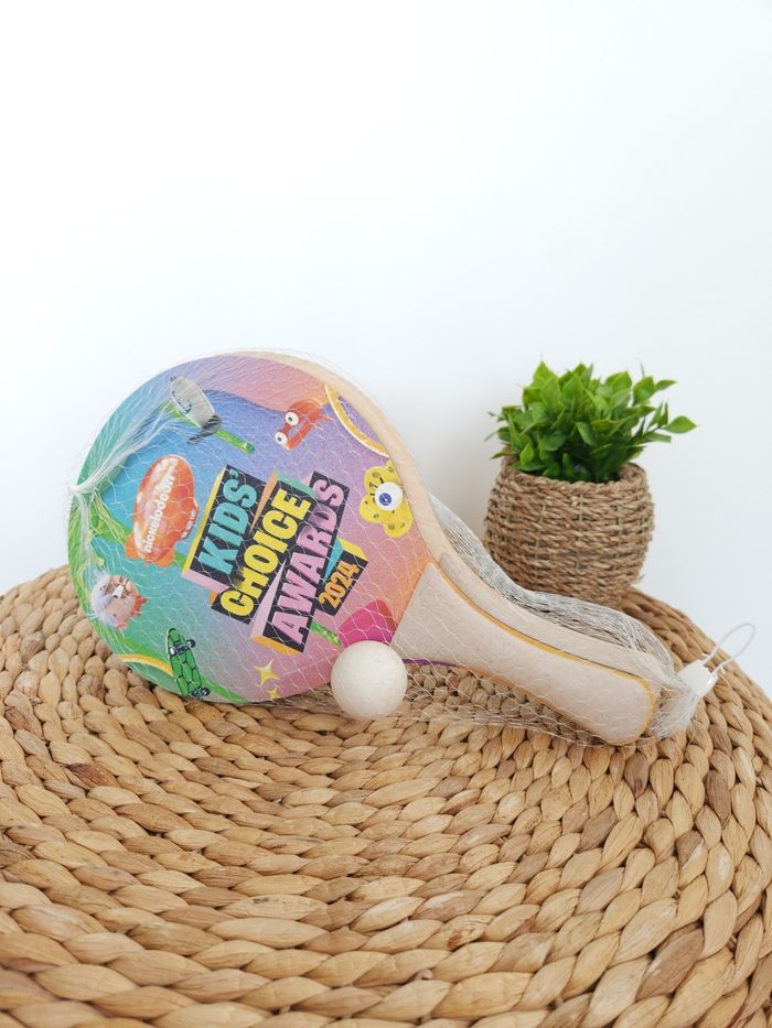 🏓 Jeu Tennis de plage 🥎 Nickelodeon 🏓 🖊 ÉTAT ✅️: Neuf 🆕️ - Jamais utilisé 🖊DESCRIPTION🏓: ■ Set de Jeu 2️⃣ Raquettes & balle 🥎 en bois 🪵 ■ Diamètre: 22 cm 📏 ■ 1️⃣ Face imprimé Kid's Choice Awards 2024 / 1️⃣ Face uni en bois ■ Âge📅: 3️⃣ ans et ➕️ 📙