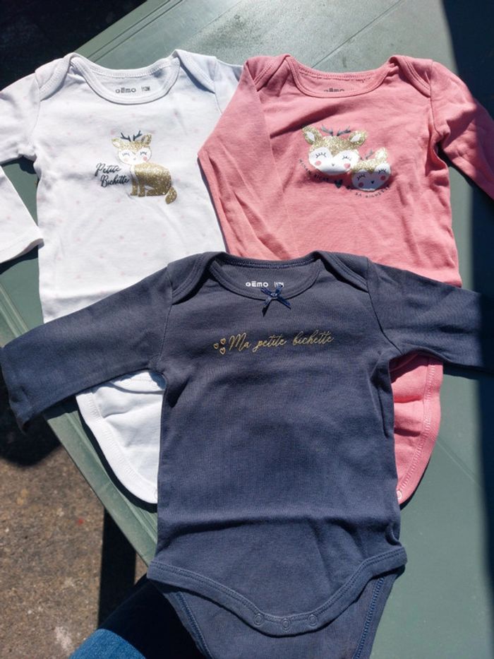 Lot de 3 bodys manches longues de marque gémo taille 12 mois. ⚠️ taches sur le blanc à l'intérieur là où l'on ferme le body (voir dernière photo)