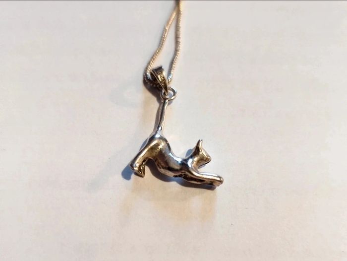 • Neuf • Long collier • Environ 26cm • Chaîne très très fine • Marque inconnue L'inscription 925, certifiant que le bijou est en argent est sur un petit anneau, voir l'avant dernière photo (même si peu visible, il faut une loupe). Il y figure également sur le chat. #collier #collierenargent925 #collier925argent #bijouxargent #bijouxfemme #femme