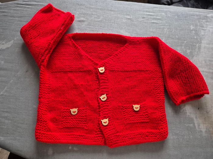 gilet rouge fait main boutons en bois petits chats . jamais porté . taille 3 mois