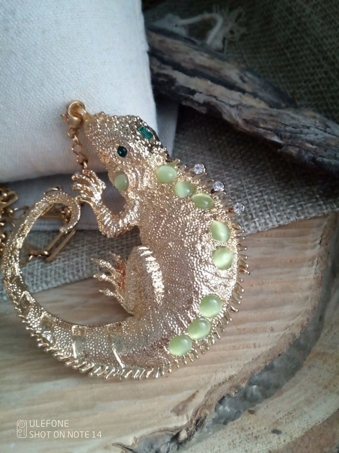 Collier iguane et pierres naturelles oeil de chat vert pomme - photo numéro 2