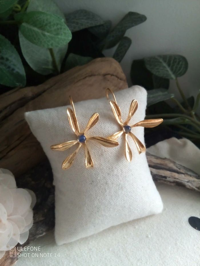 Boucles d'oreilles fleurs dorées et pierres de kyanite naturelles