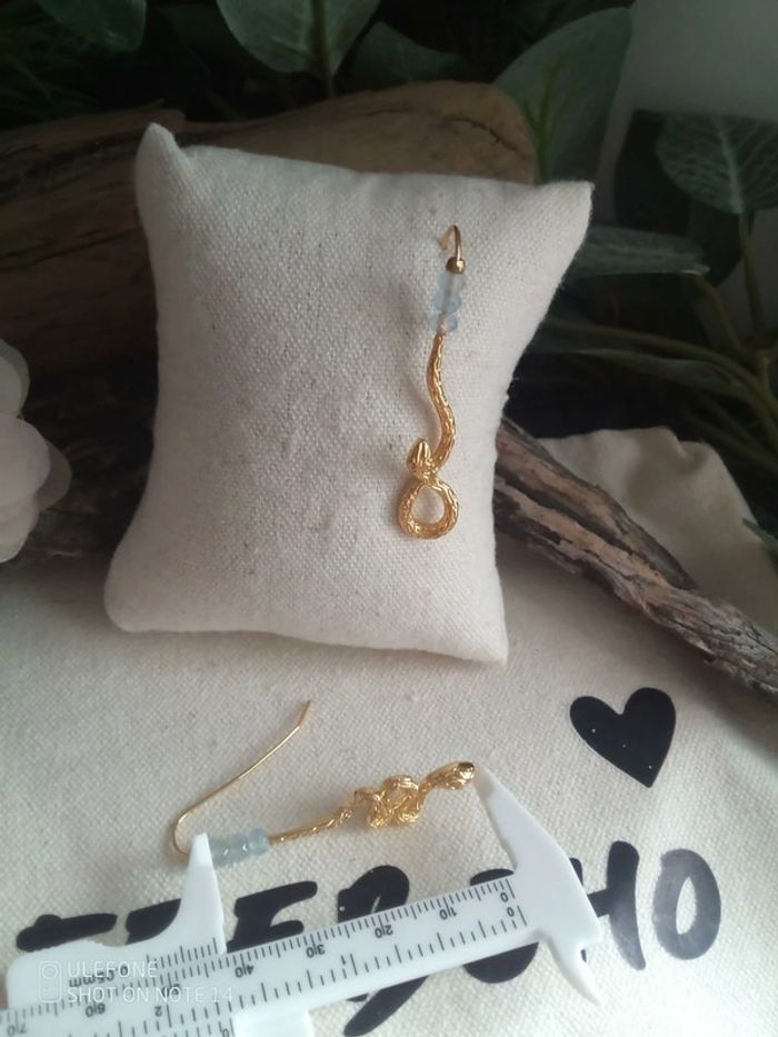 Boucles d'oreilles bohèmes asymétriques serpents et pierres aigue marine - photo numéro 2