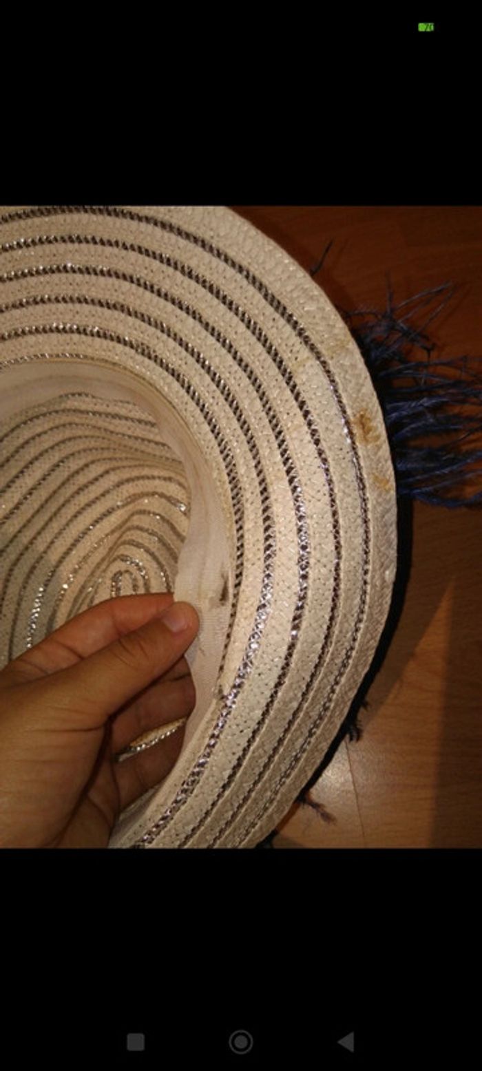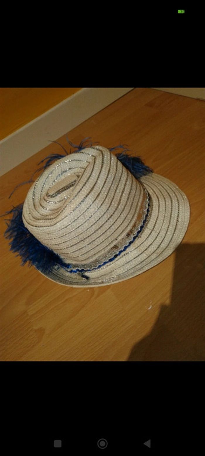 Chapeau , utilisé surtout pour déguisement. Taille unique. #accessoirecarbell Couleur blanc avec plume bleu et strass. Divers traces d'utilisation. À noter à l'intérieur une trace bien visible sur la photo 4 ainsi qu'un petit trou visible au bout de mon pouce . #ma