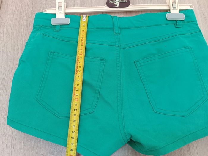 Short taille 38 , très fin. Denim co. Couleur vert turquoise . Très bon état. Dimensions sur les photos Taille 38, taille basse. #carbelltaille38femme #moi 2 poches avant + 2 arrières. Possibilité de mettre une ceinture. Braguette fermeture éclair, fonctionne très bien 🌼