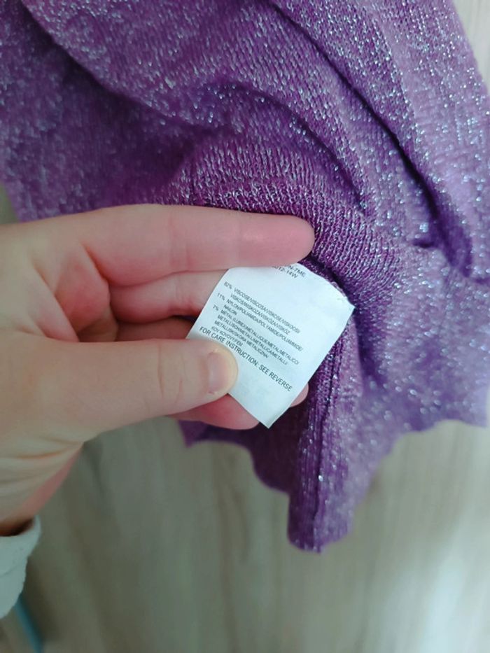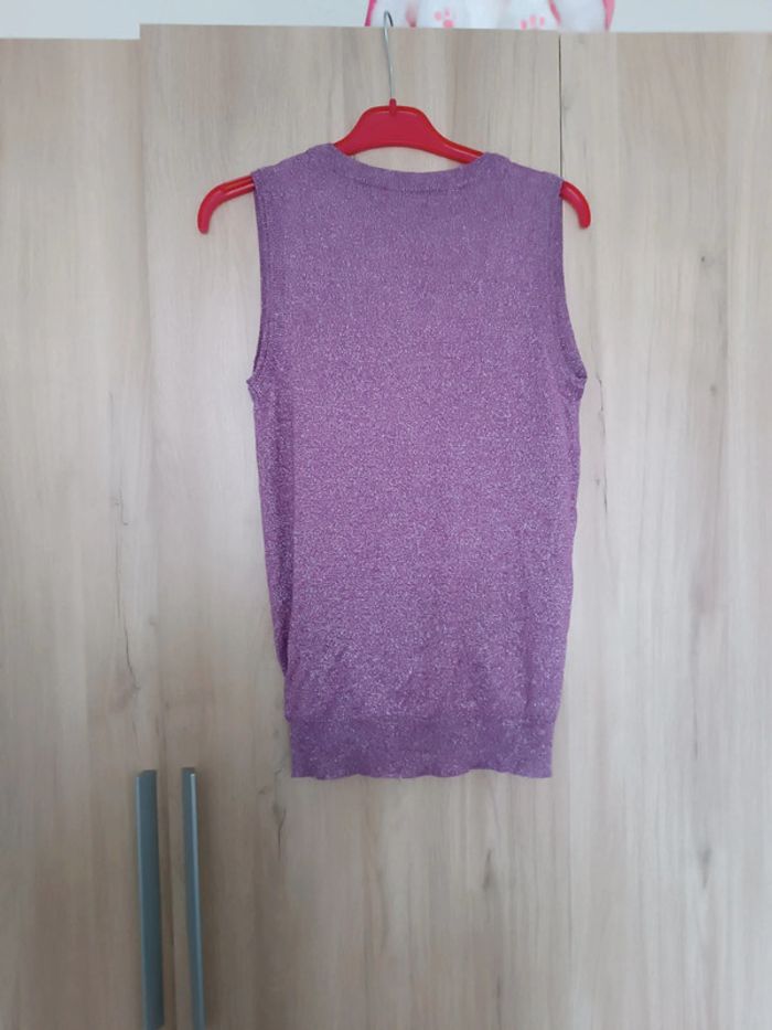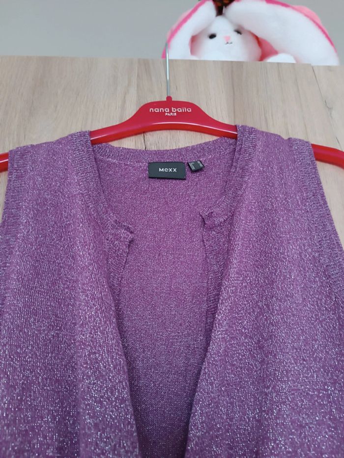 Pull très léger type cache coeur Couleur violet a paillettes Mettre un t-shirt dessous Marque mexx Sans manches Matière Très élastique Très bon état #carbelltaille40femme #ma