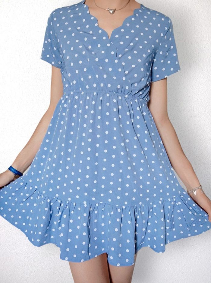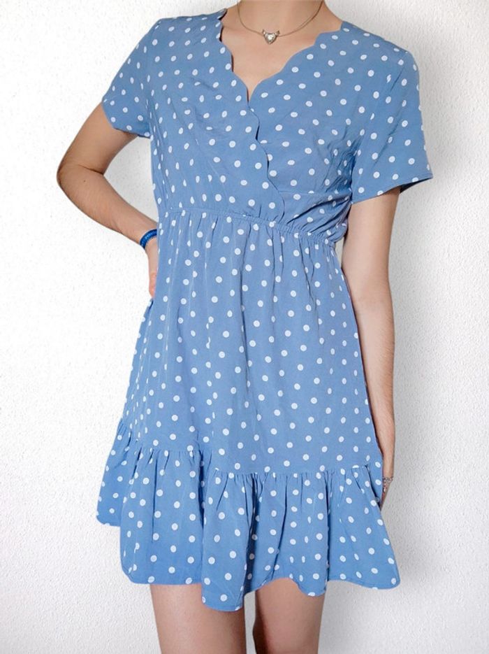 Vestido skater, escote en pico ondulado, corte envolvente, azul con lunares blancos, manga corta