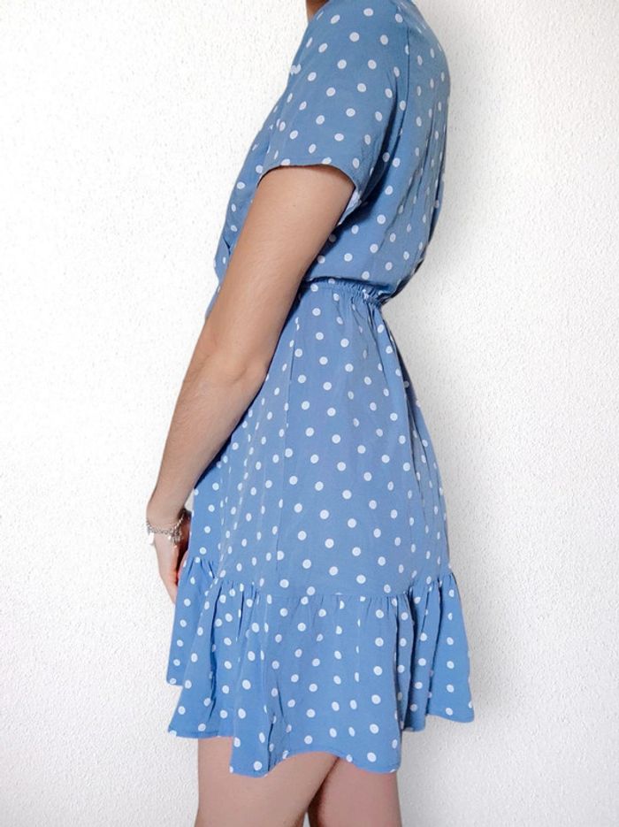 Skater dress, wavy V-neck, wrap-around shape, blue with white polka dots, short sleeves