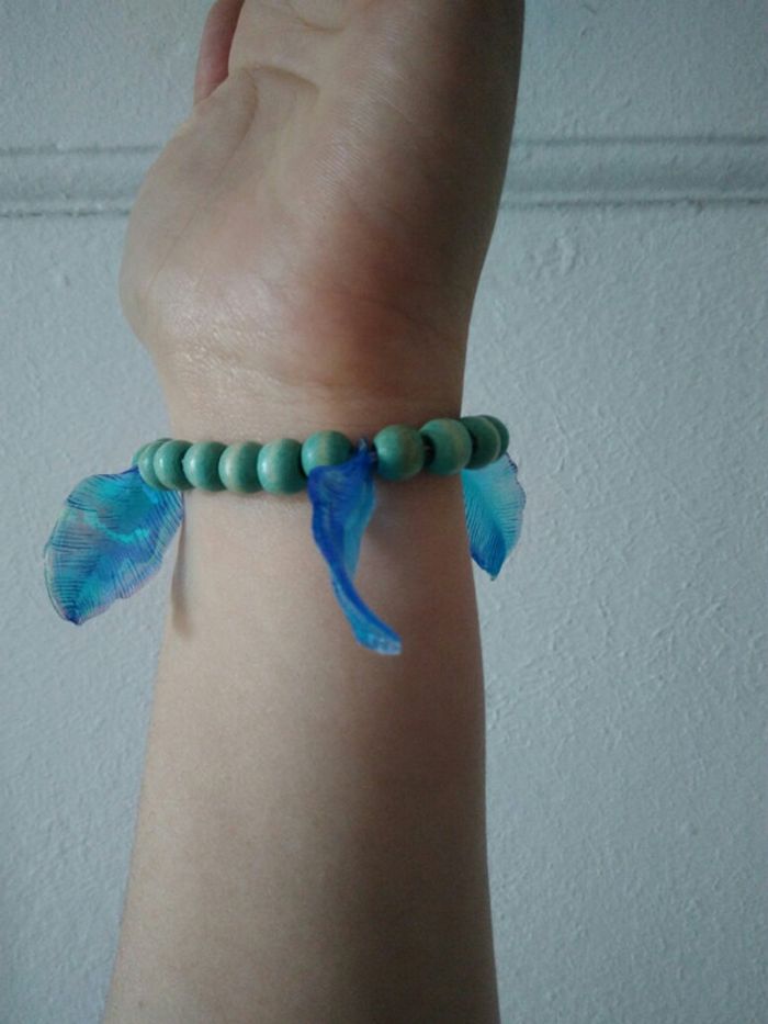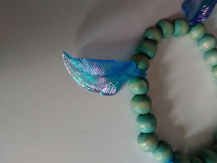 Bracelet de couleur bleu , perles en bois de couleur bleu turquoise , et 4 feuilles en plastiques de couleurs bleu marine. Pour tour de poignet de environ 16 cm de tour. Bracelet # #49angers #angers #carbellbijoux