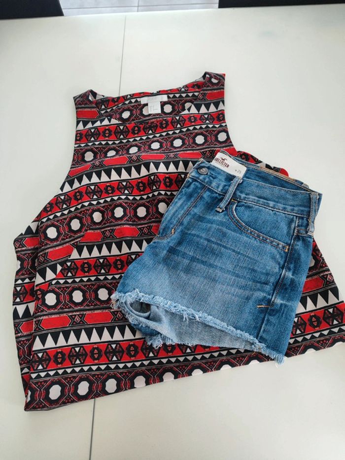 1 short en jean Hollister taille w25 soit 32 (mais plus 34) 1 tunique longue h&m taille 34 Excellent état quasi pas porté