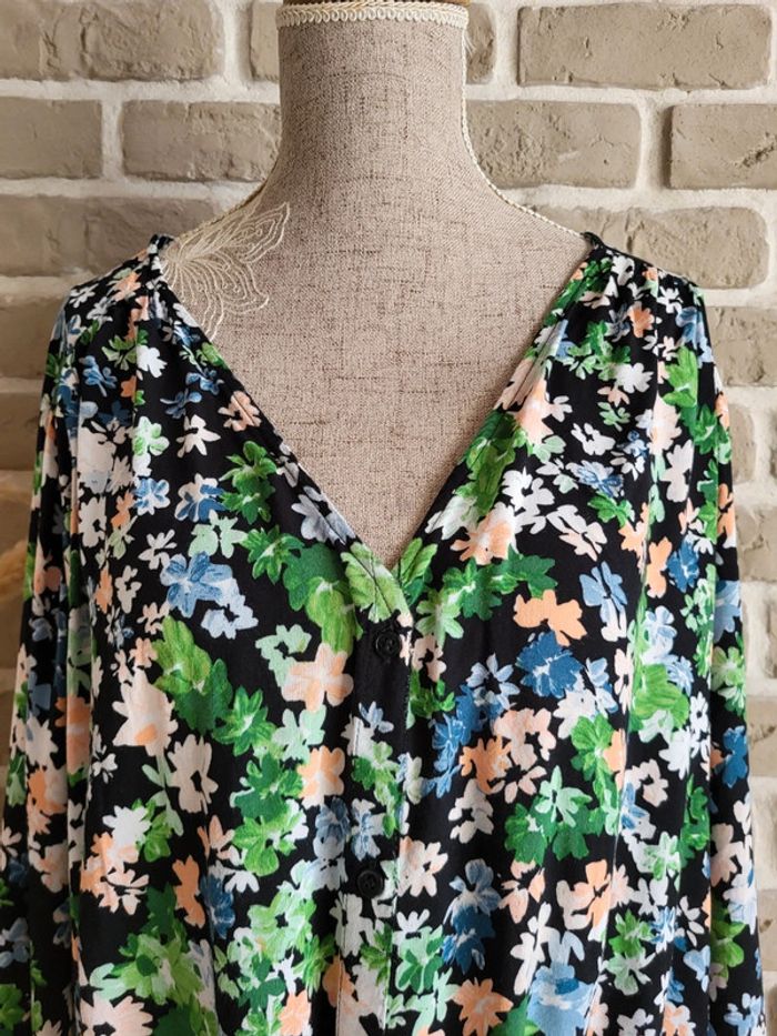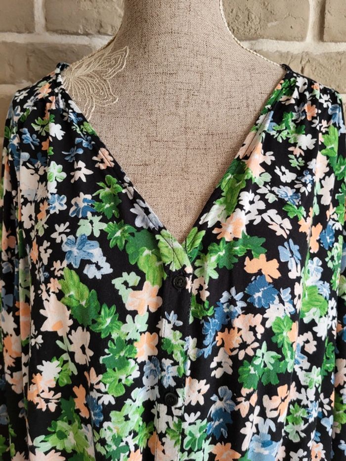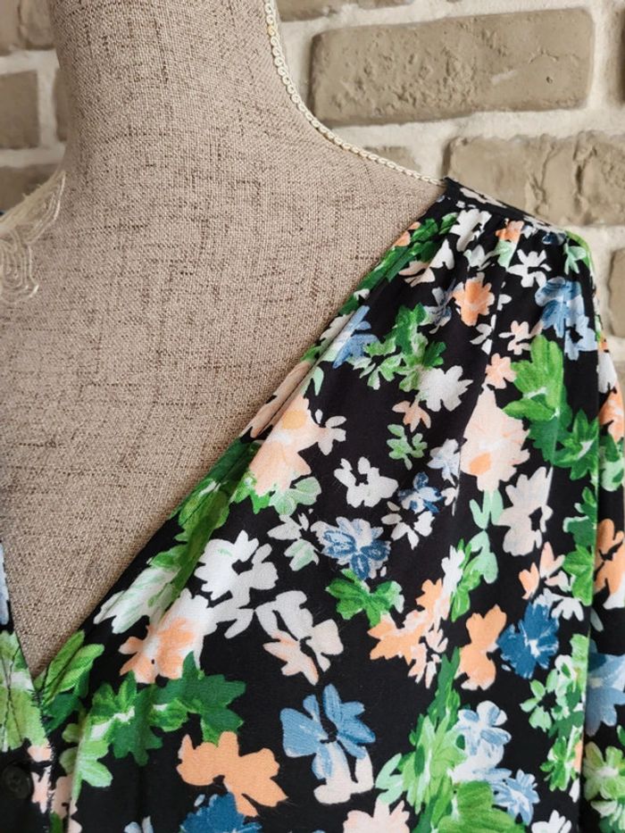 💝 Bénéficiez d'une réduction en créant lot dans mon dressing 🛍️ 🌸 Blouse ample et fluide H&M en très bon état, peu portée et sans défaut 🎀 Matière agréable avec un imprimé fleuri dans les tons vert, rose saumon, bleu et blanc sur fond noir 🪷Décolleté en V et boutonnée devant avec un nœud à la base Manches longues boutonnées aux poignets 🍥Taille XL 42 🩷 Idéale pour un look bohème chic associée à un jean, un short ou à une jupe longue