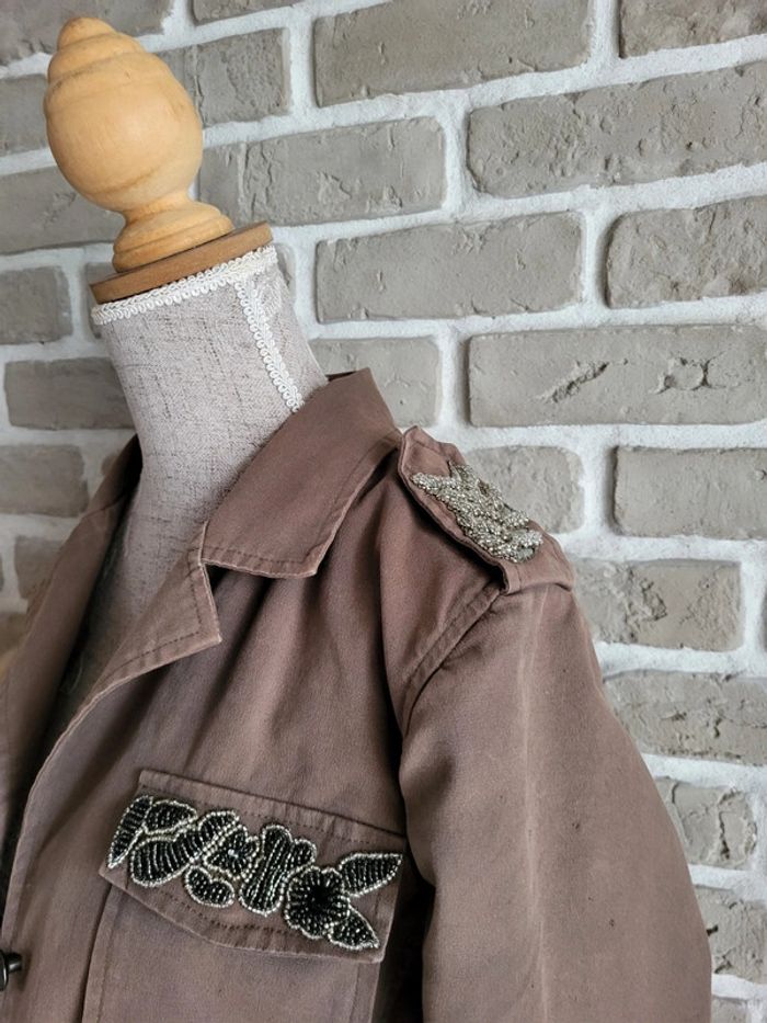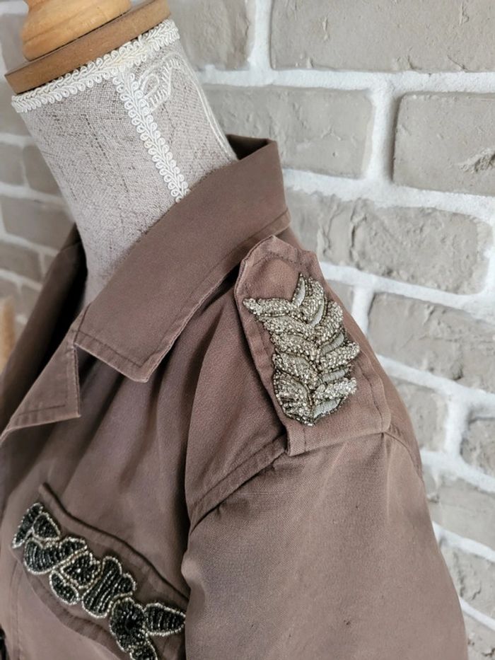 Décor de broderies avec perles au col, aux épaules et sur un rabat