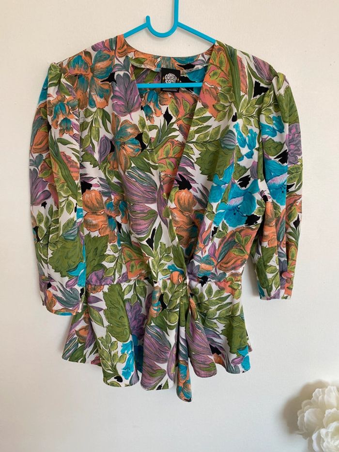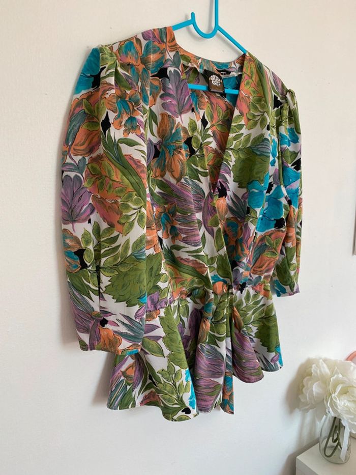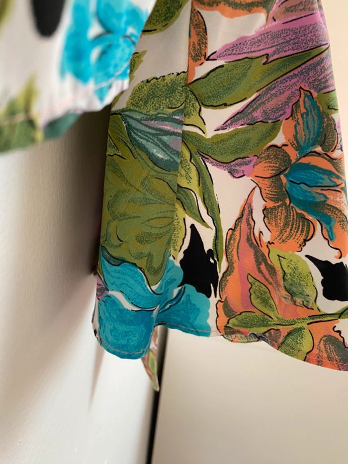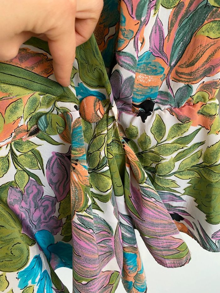 Magnifique blouse Golden Gate Taille M ( pas d’étiquette taille) Colorée et fleurie En très bon état sauf un petit accro en bas derrière voir 2 dernière photo ( très discret du fait des motifs et de la couleur)