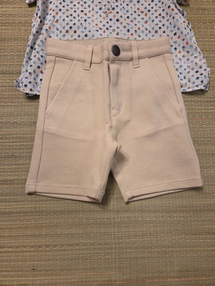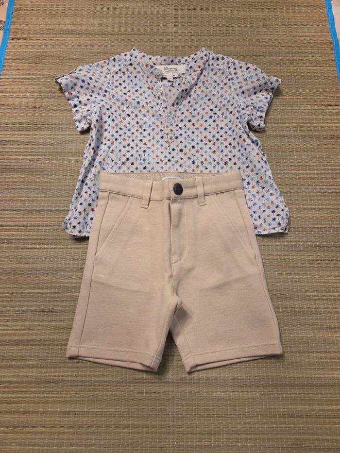 Chemise bonpoint tres légère portée 2 fois Short neuf, taille trop ajustée pour mon fils Idéal cérémonie estivale type mariage, bapteme... Prix sur les lots. Maison non fumeur, sans animaux.