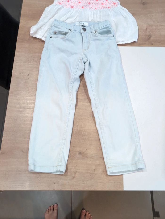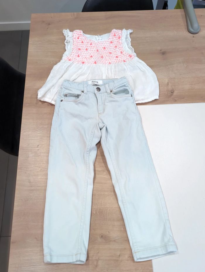 Top en lin smocks et pompons Jean super souple a cerises brodées Sincèrement très confortable et super rendu mais ma fille n'a voulu la porter qu'une seule fois... Maison non fumeur, sans animaux. Lessive hypo allergénique. Prix sur les lots. #Julieber_4ans