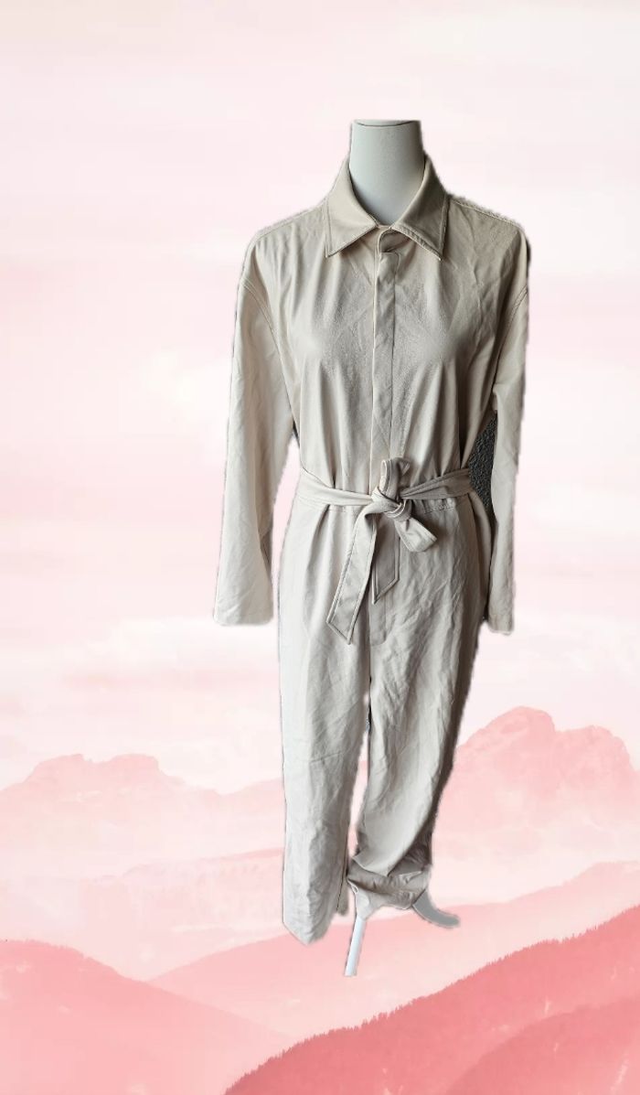Combinaison crème en simili cuir avec ceinture Camaïeu Taille 44 Neuve sans étiquette, jamais portée 100% polyester Aisselles à Aisselles : 47 cm Hanches: 44 cm Largeur bas de jambes : 20 cm Longueur : 142 cm