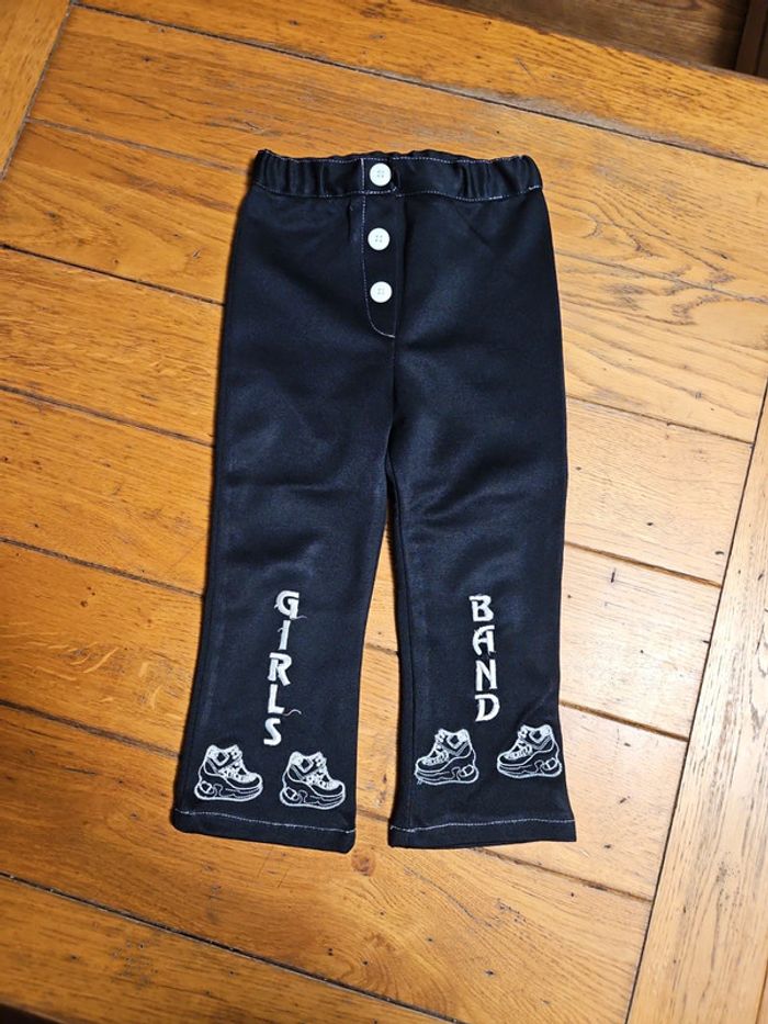 Pantalon noir synthétique, fille 4 ans. Motif chaussures sport, inscription "girls band". Marque inconnue, en très bon état. #shatenew_4ans