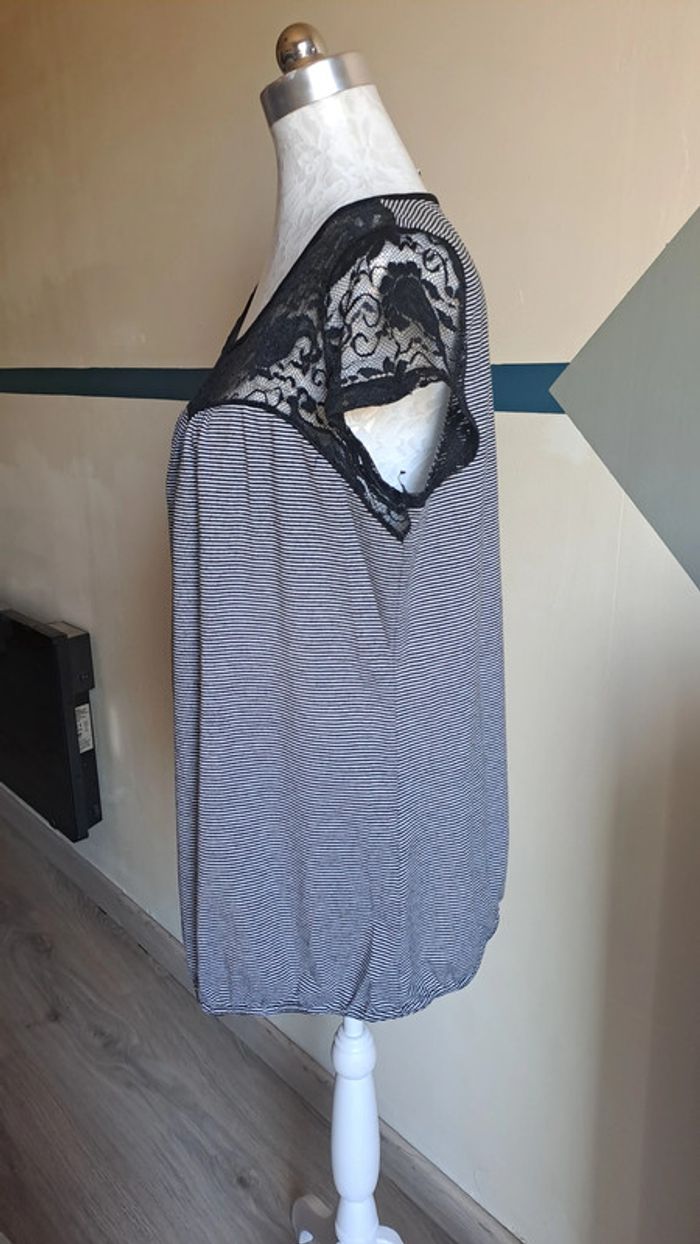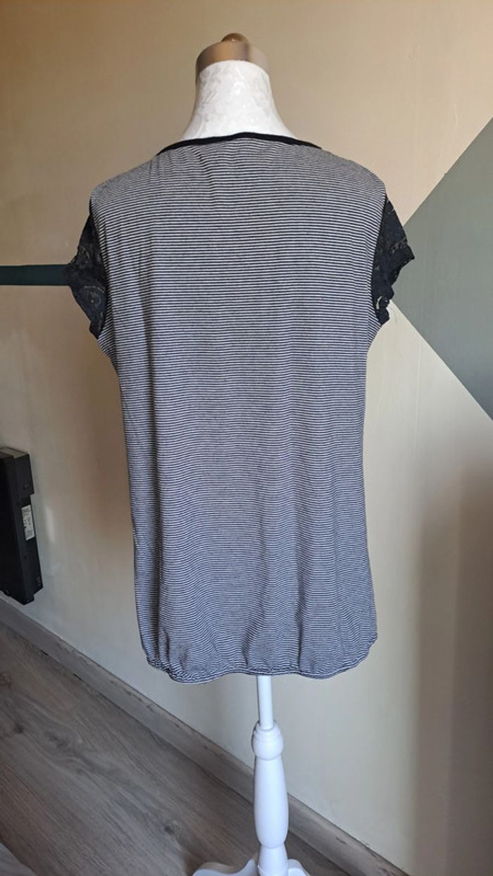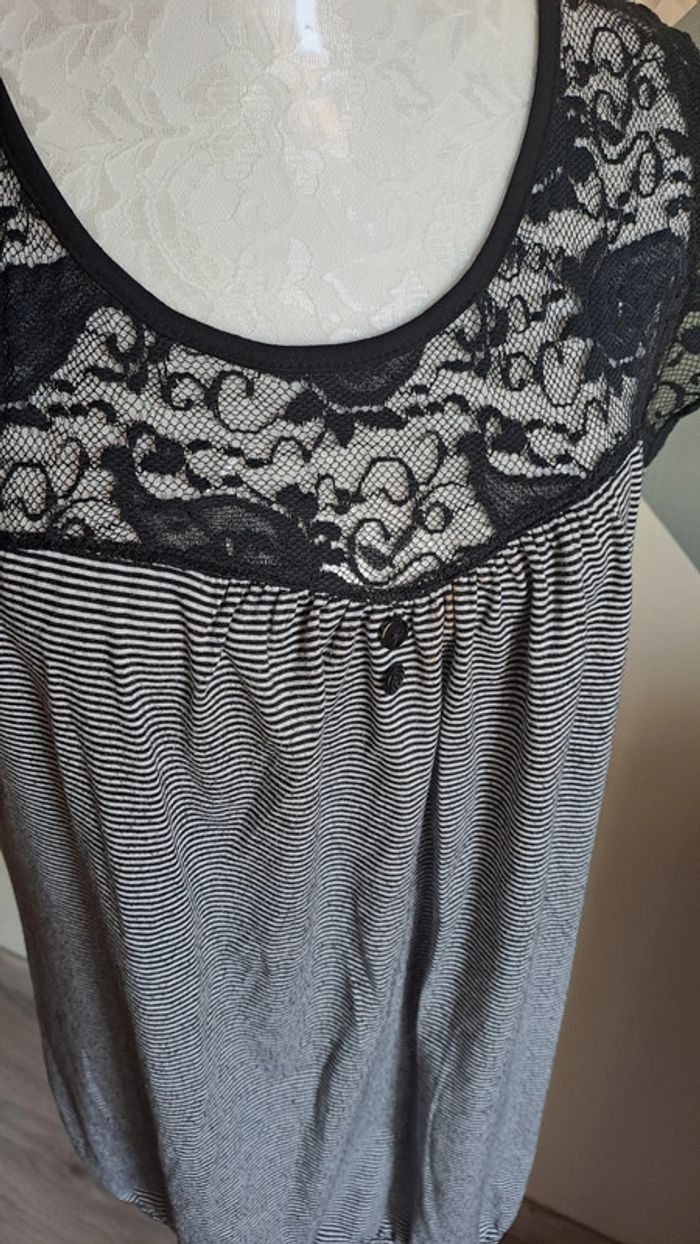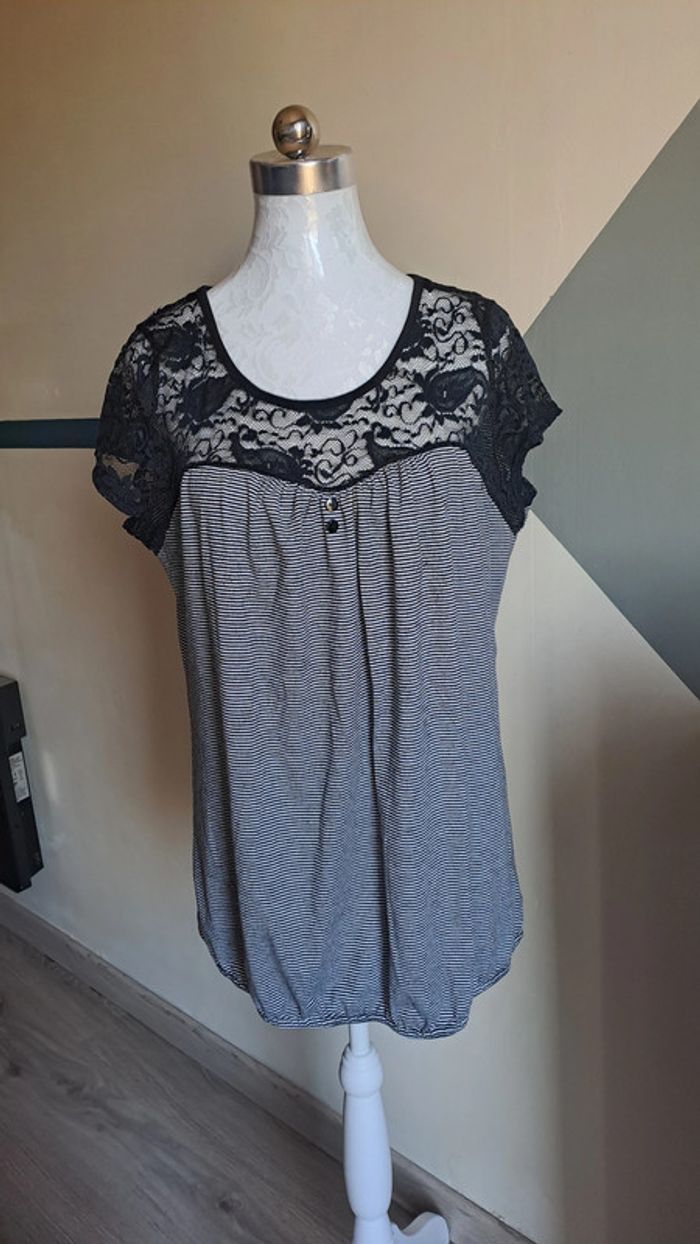 🦚Tee-shirt femme en très bon état de couleur noir et gris avec de la dentelle. 🧵97% viscose, 3%elastane. 📏Epaule à epaule: 42cm 📏Aiselle à aiselle: 54cm 📏Longeur : 65cm 🦚Dressing trier par # dans mon " à propos". #gavelotsT42femme