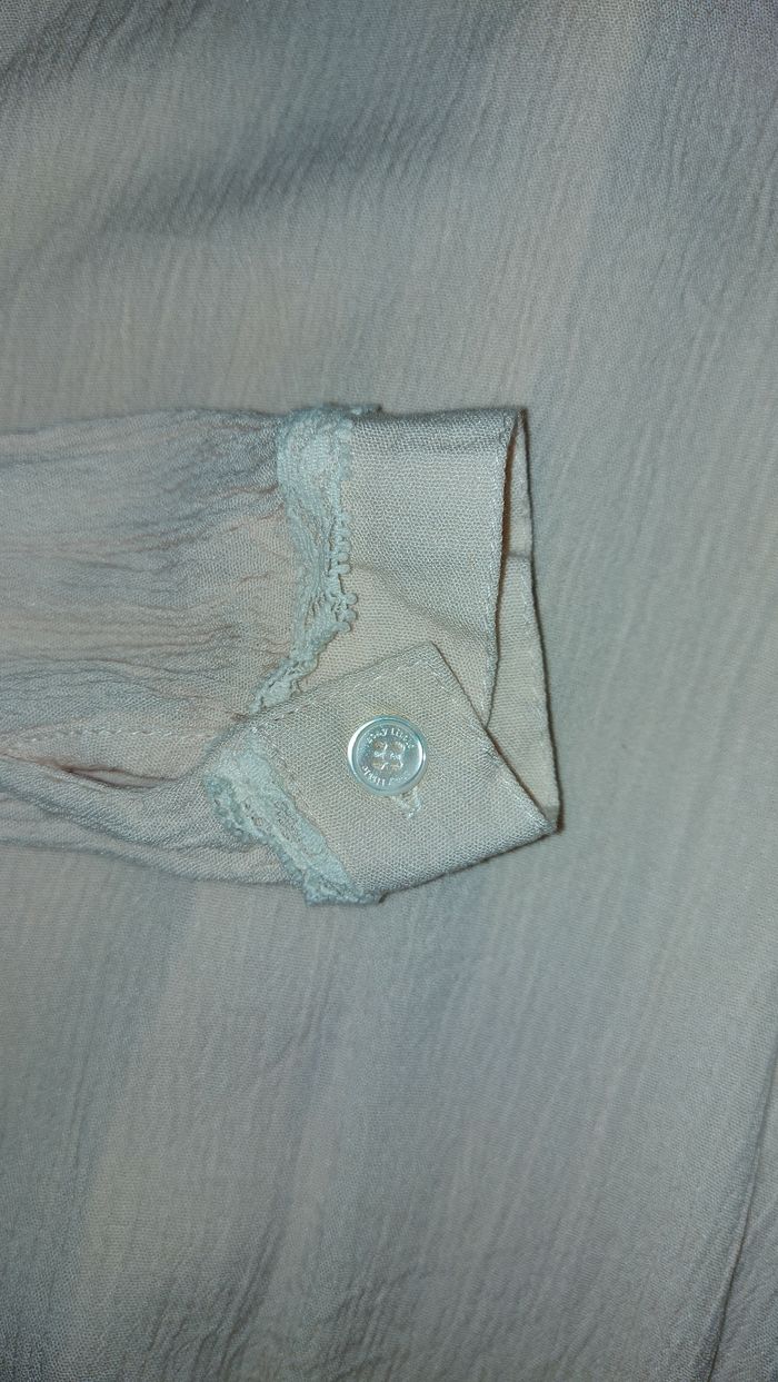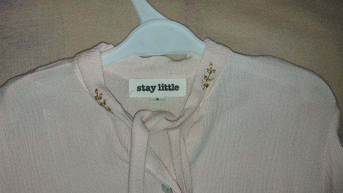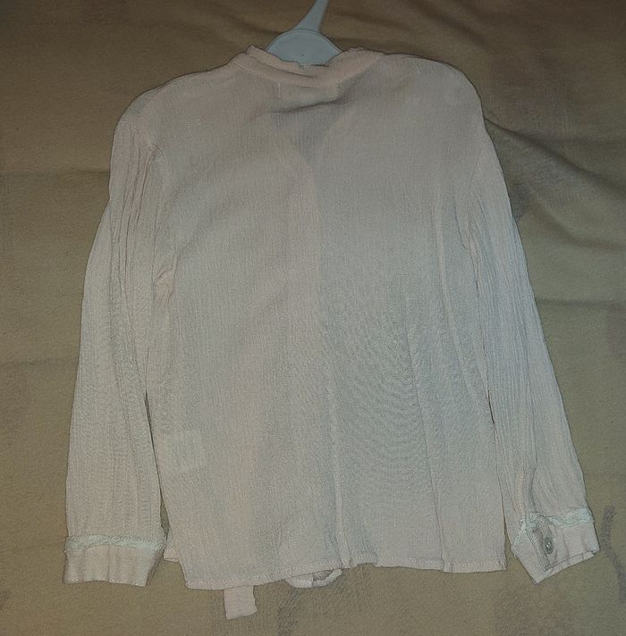 Neuf, lavé jamais porté Matière fluide et légère Jolis détails sur le col et dentelles aux bouts des manches Couleur pêche très clair Marque Stay Little