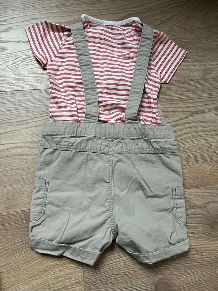 Ensemble salopette-short beige et t-shirt blanc avec rayures. Très bon état