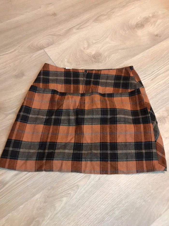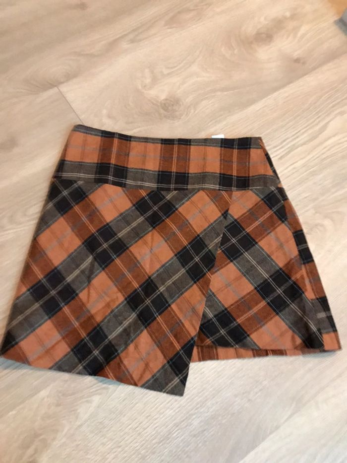 Jupe courte écossaise orange et noir asymétrique, en taille 38 camaïeu. Fermeture éclair derrière, en laine et polyester