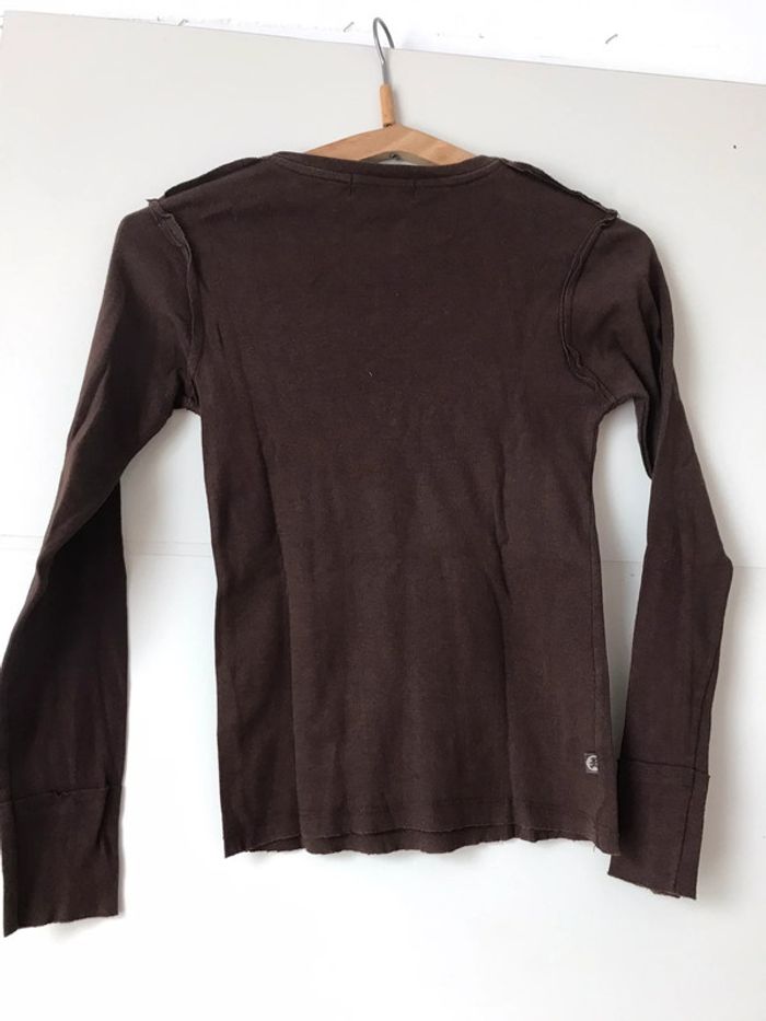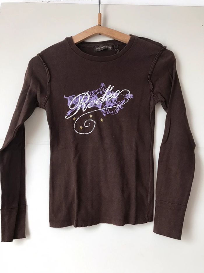 T-shirt manches longues Lulu Castagnette taille S marron avec strass et inscription Rodéo en violet. Très bon état.