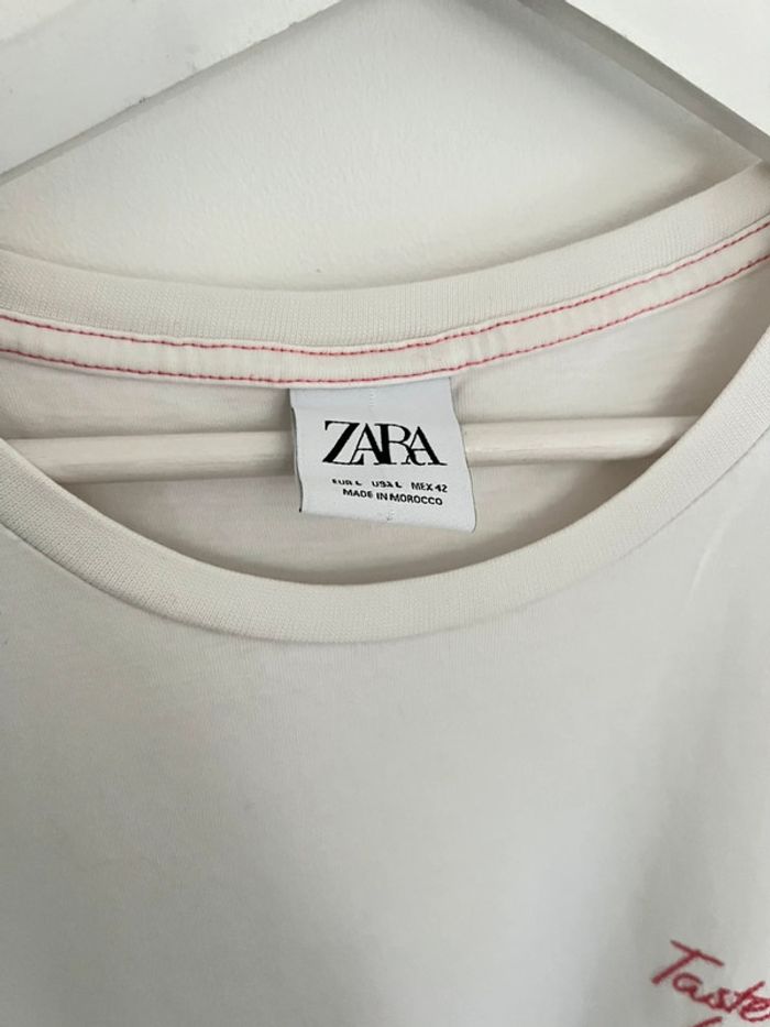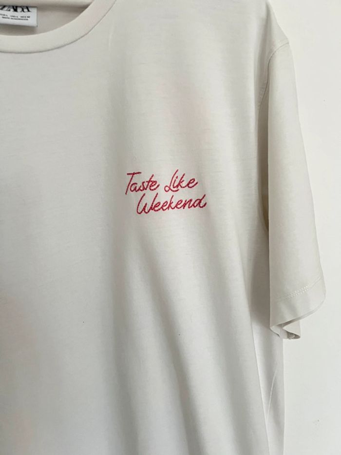 T-shirt homme manches courtes Couleur blanc avec couture rose et brodé Taste Like Week-end Marque Zara Taille L