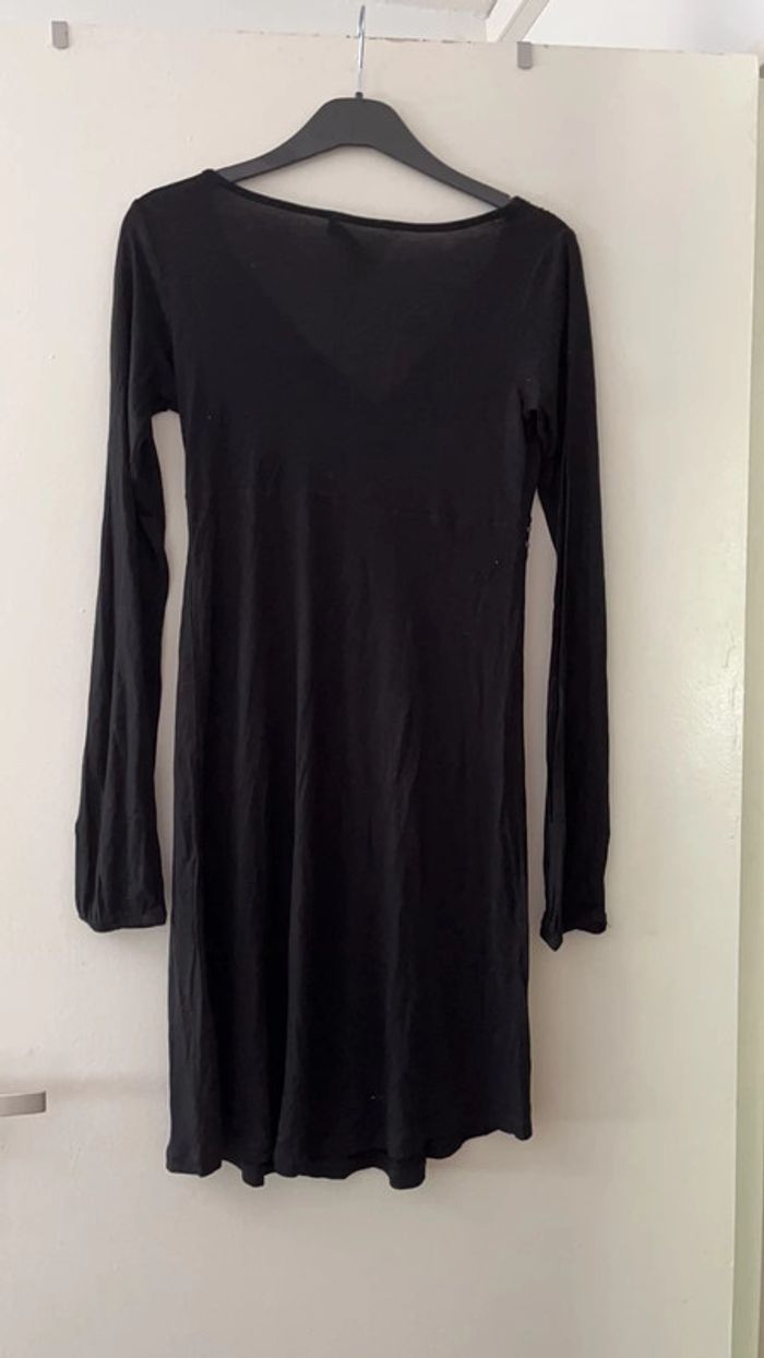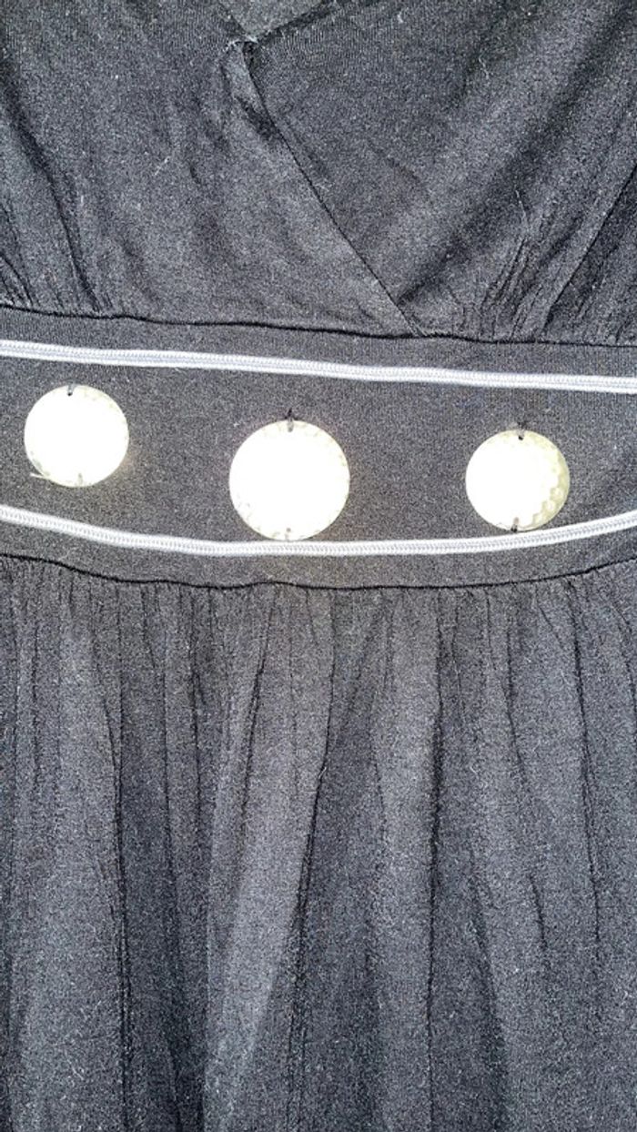 Bon etat tissu très léger manches elastiquées recousu niveau poitrine le décolleté était trop important pour moi étiquette Morgan décousue d un côté quelques pièces décoratives niveau taille cousues d un seul côté robe comportant quelques imperfections mais très agréable portee et très originale