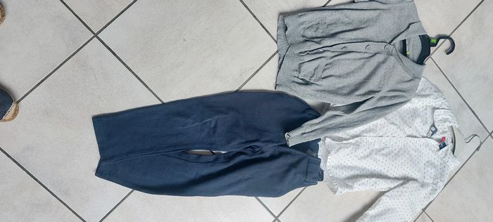 1 pantalon léger marine côtelé 5ans (a ete porté ) 1 chemise kiabi blanche à motif 1 gilet gris orchestra