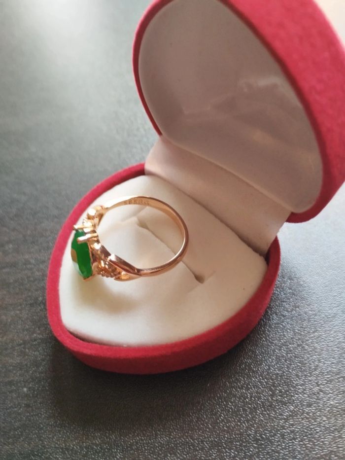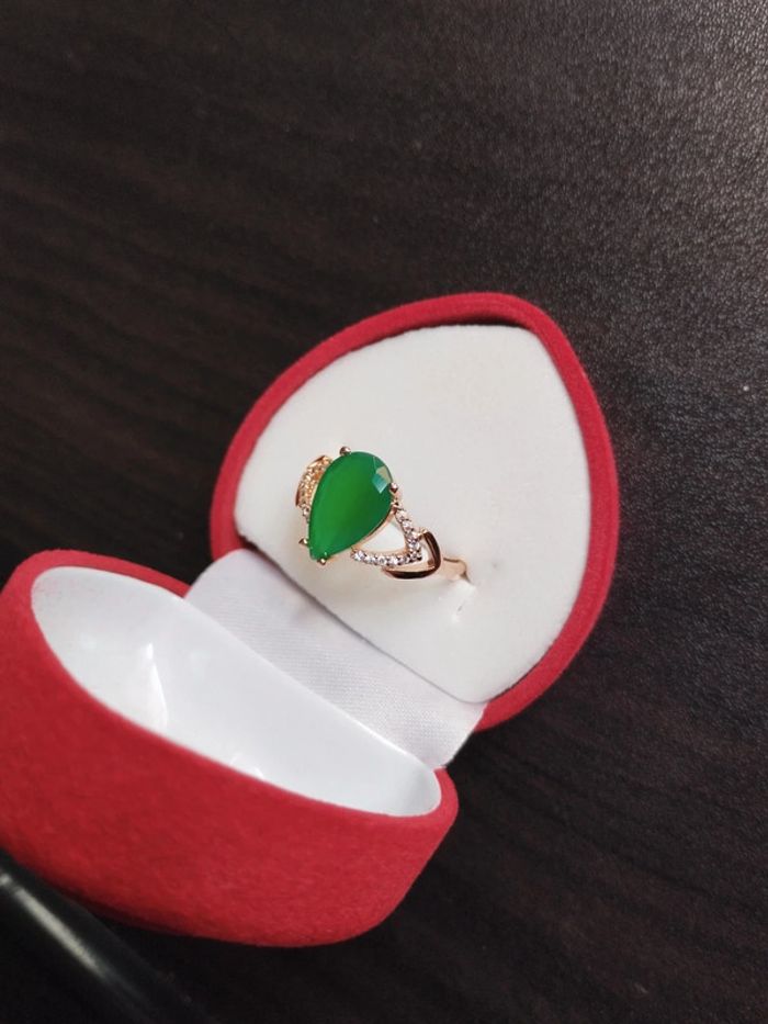 Anneau en plaqué or rose 585/1000e serti d'un zircon vert émeraude taille poire entouré de petits zircons blancs taille brillant de 1mm. Taille 59 (19,5mm) Vendue neuve avec coffret