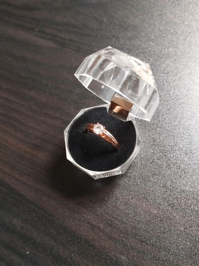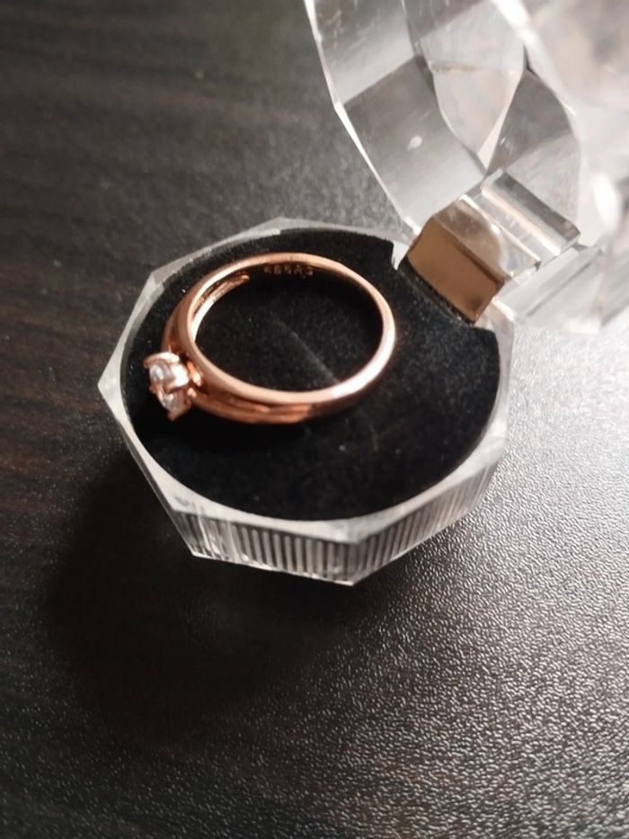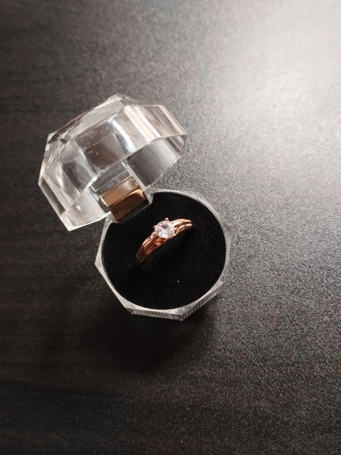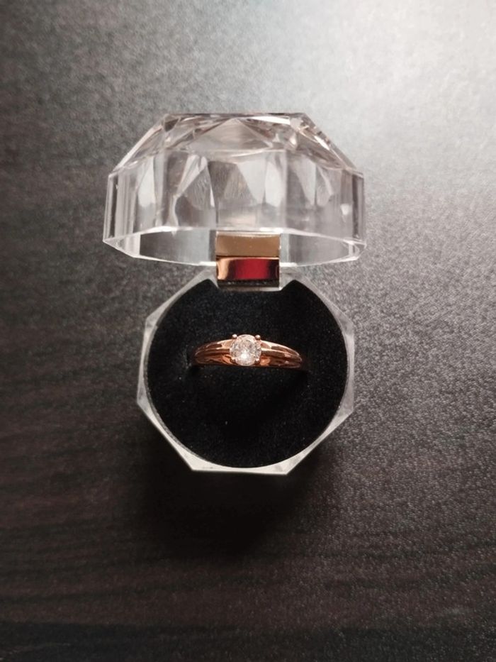 Anneau en plaqué or rose 585/1000e serti d un zircon blanc solitaire taille brillant de 4 mm. Taille 59 (19,5mm) Vendue neuve avec coffret