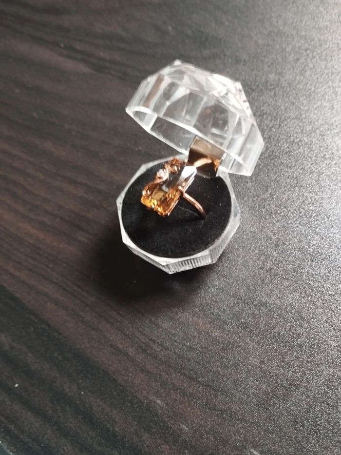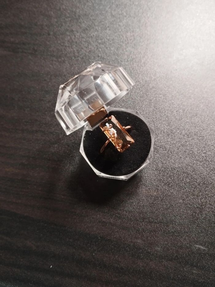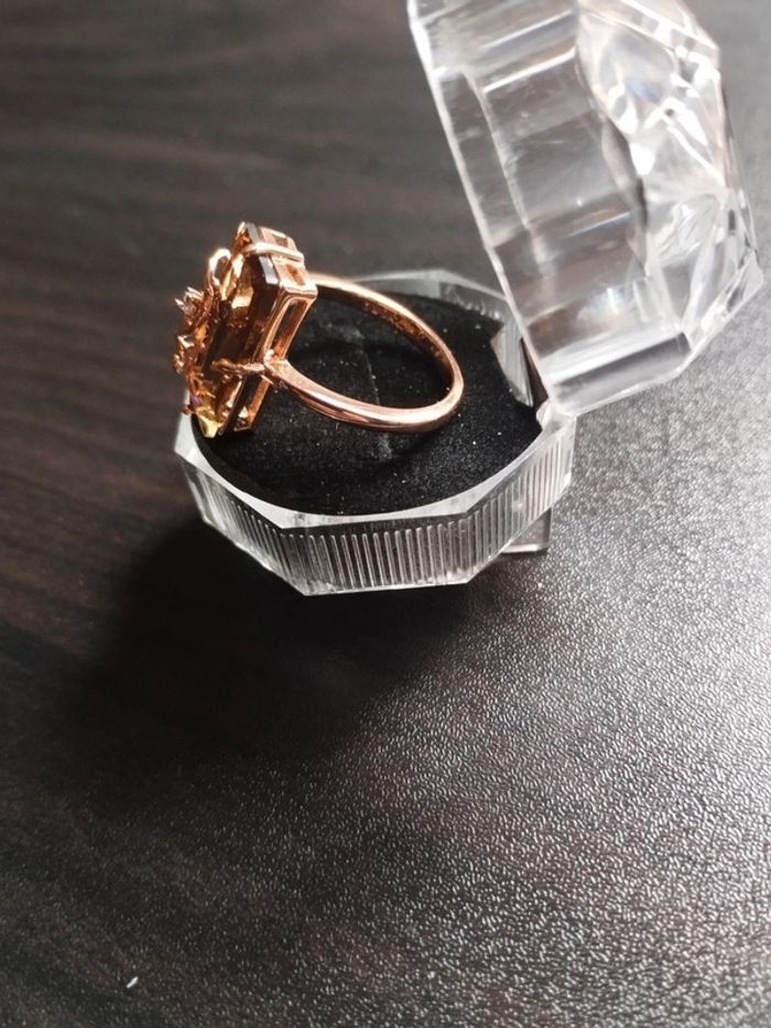 Anneau en plaqué or rose 585/1000e serti d'un zircon taille émeraude couleur champagne. Taille 59 (19,5mm) Vendue neuve avec coffret