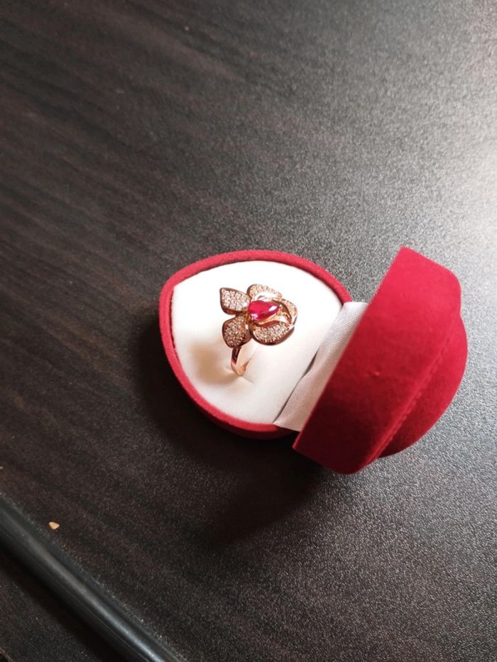 Anneau en plaqué or rose 585/1000e serti d'un zircon rouge sang de pigeon taille poire au centre entouré de petits zircons blancs taille brillant de 1mm. Taille 59 (19,5mm) Vendue neuve avec coffret