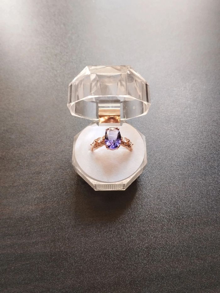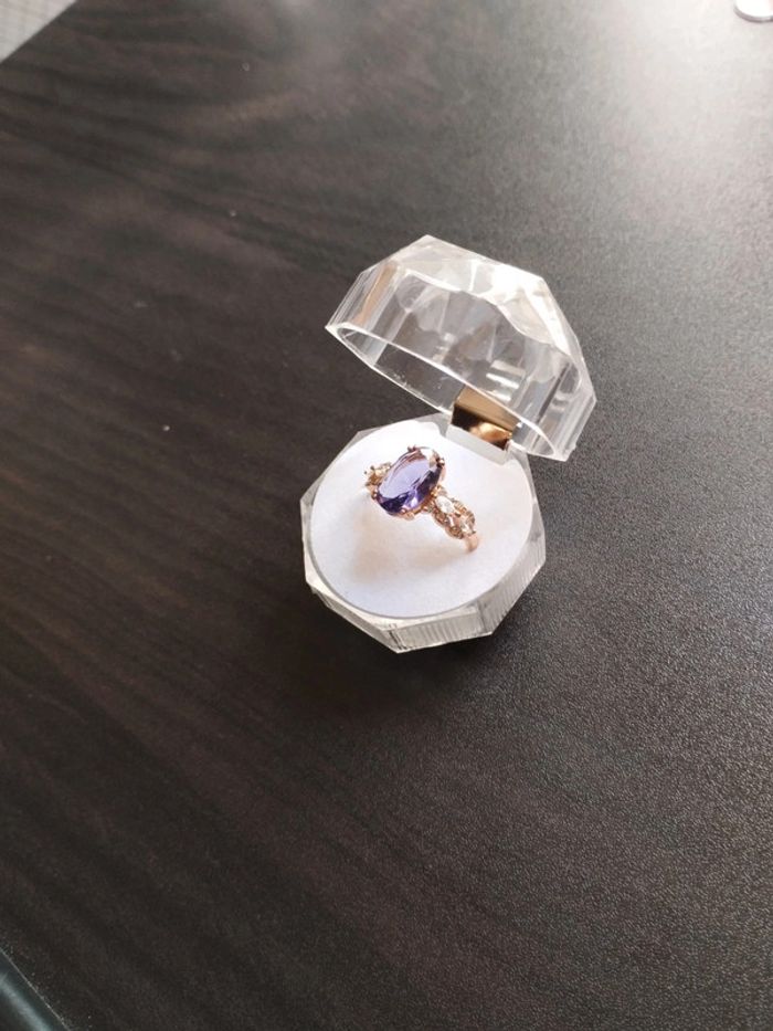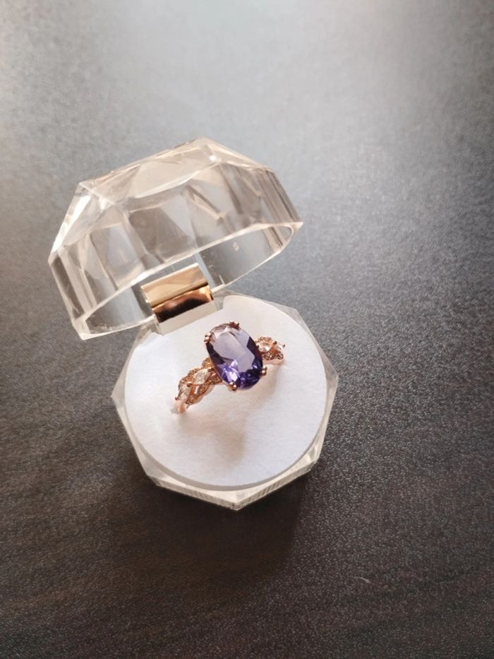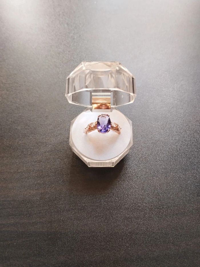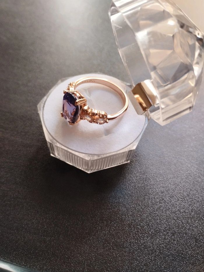 Anneau en plaqué or rose 585/1000e serti d'un zircon violet taille ovale à facettes au centre entouré de zircons blancs taille Marquise et brillant. Taille 59 (19,5mm) Vendue neuve avec coffret