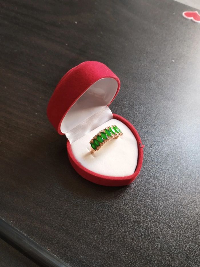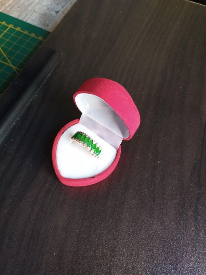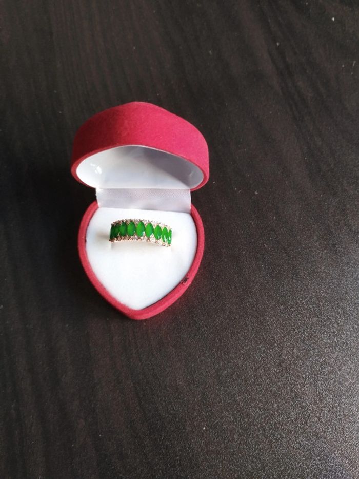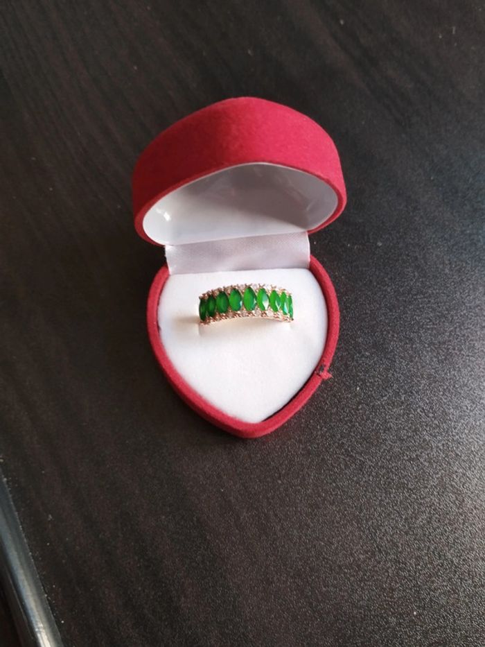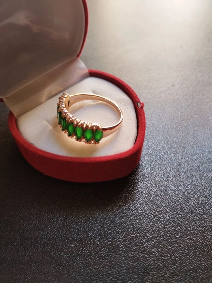 Anneau en plaqué or rose 585/1000e serti de zircons vert émeraude taille Marquise et zircons blancs taille brillant. Taille 59 (19,5mm) Vendue neuve avec coffret