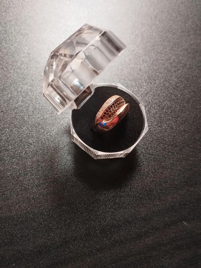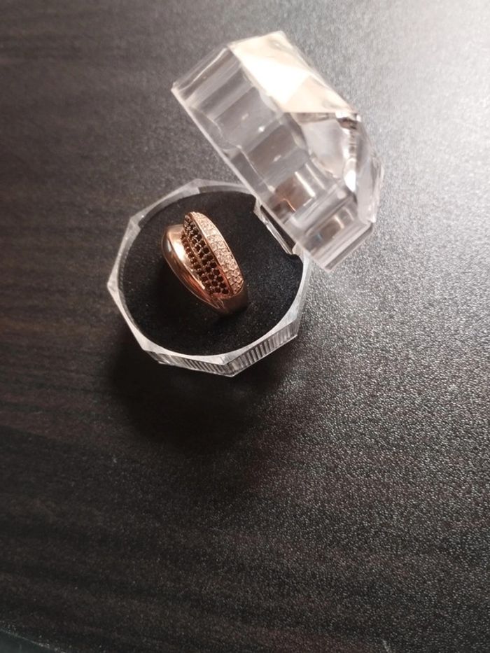 Anneau en plaqué or rose 585/1000e pavé de petits zircons blancs et noirs taille brillant de 1mm. Taille 59 (19,5mm) Vendue neuve avec coffret