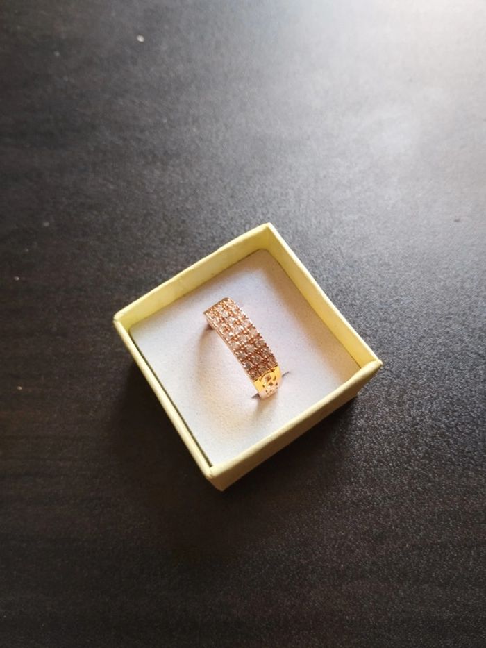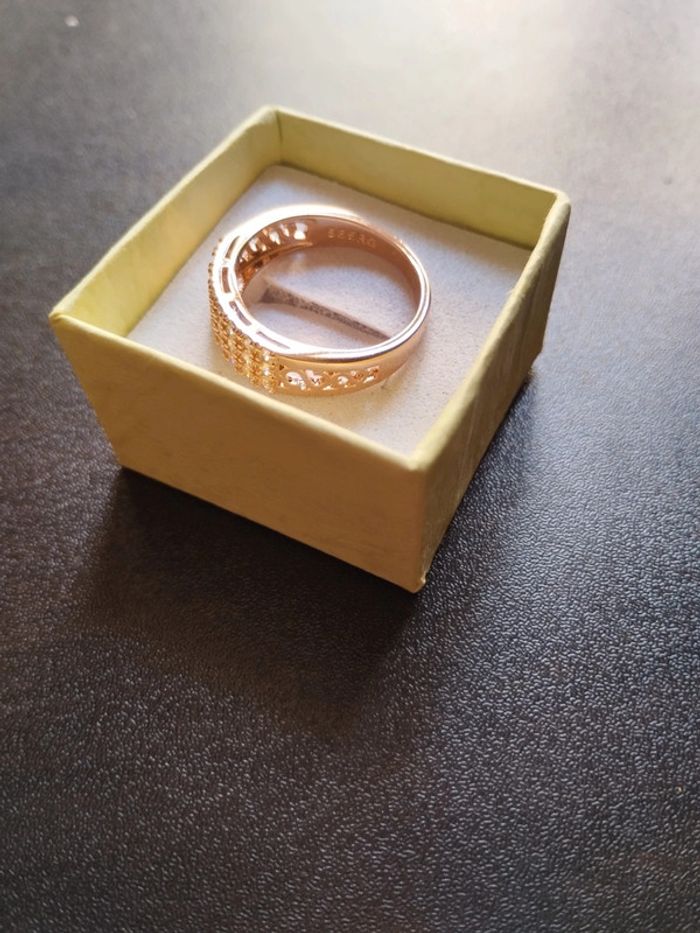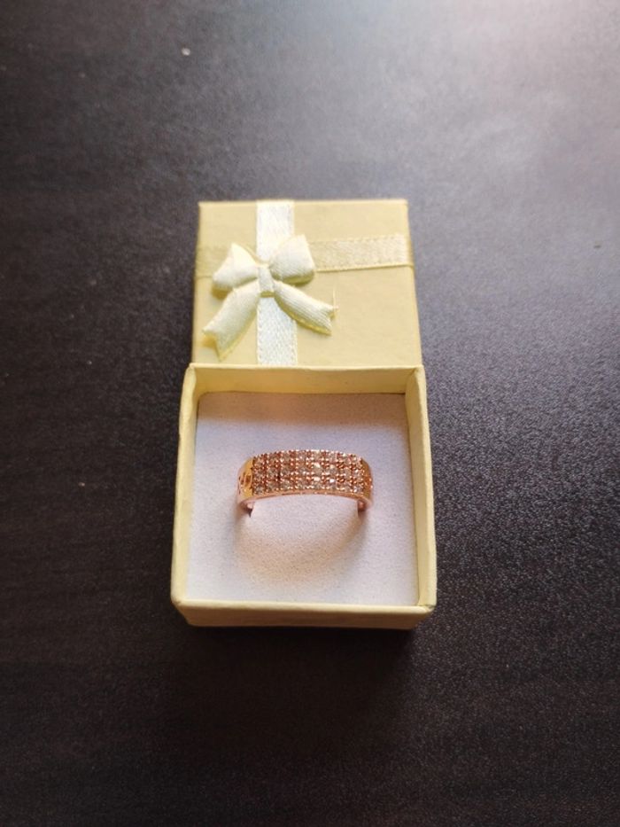 Anneau en plaqué or rose 585/1000e serti de zircons blancs taille brillant de 2 mm. Taille 59 (19,5mm) Vendue neuve avec coffret