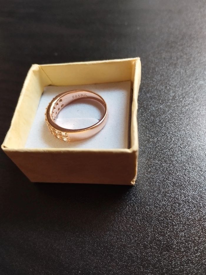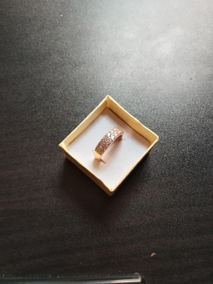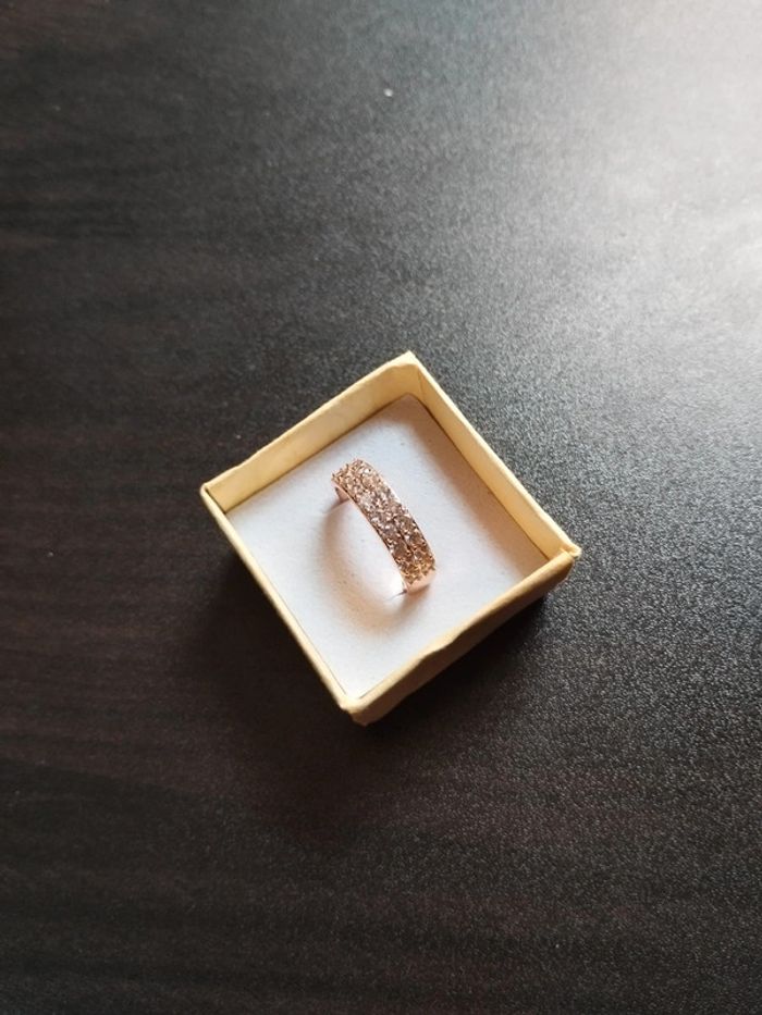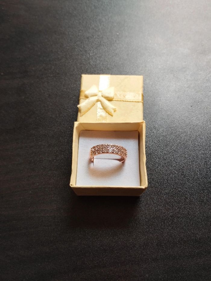 Anneau en plaqué or rose 585/1000e serti de zircons blancs taille brillant de 2 mm. Taille 59 (19,5mm) Vendue neuve avec coffret