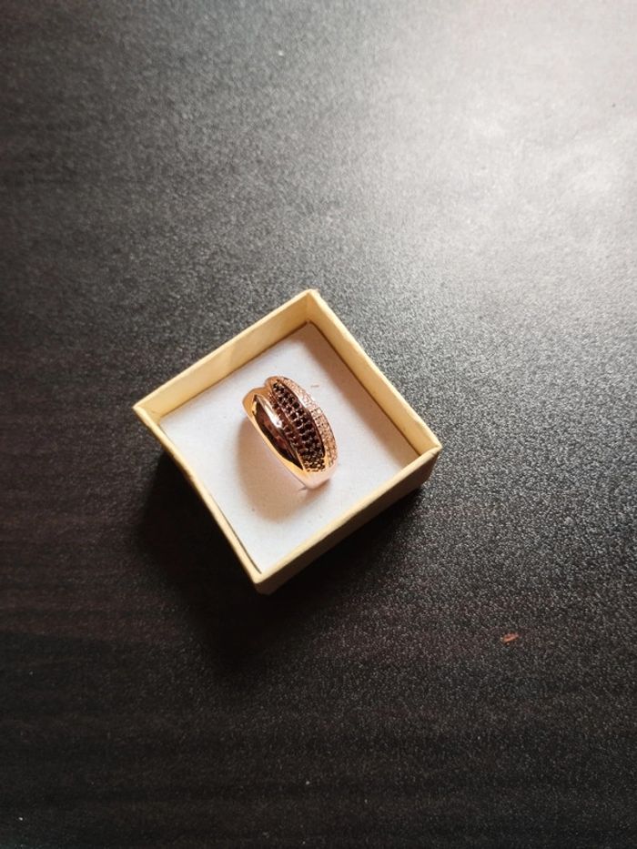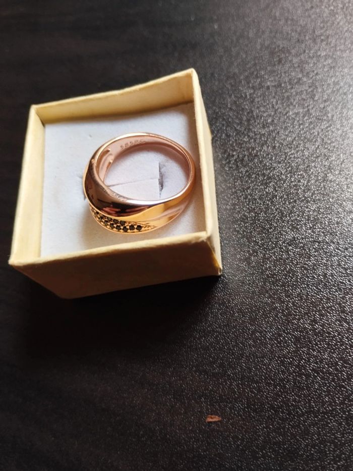 Anneau en plaqué or rose 585/1000e pavé de petits zircons blancs et noirs taille brillant de 1mm. Taille 59 (19,5mm) Vendue neuve avec coffret