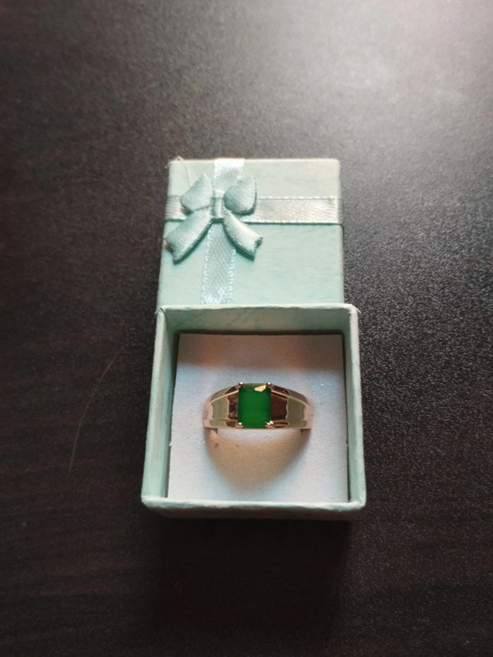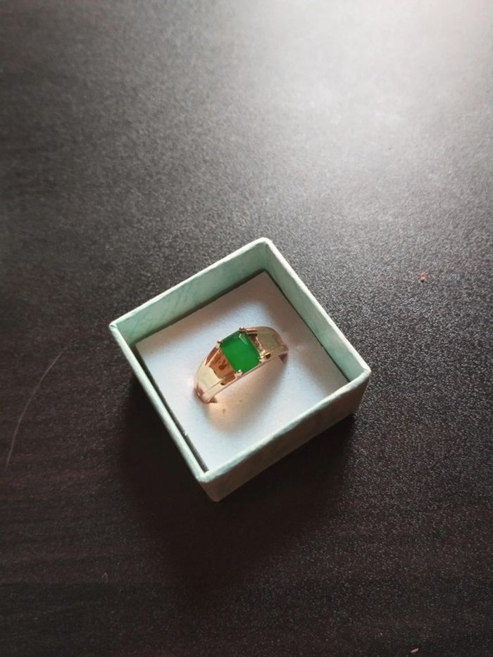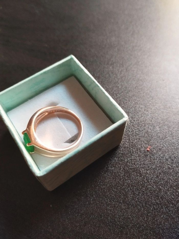 Anneau en plaqué or rose 585/1000e serti d'un zircon vert taille émeraude . Taille 59 (19,5mm) Vendue neuve avec coffret