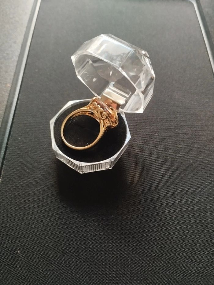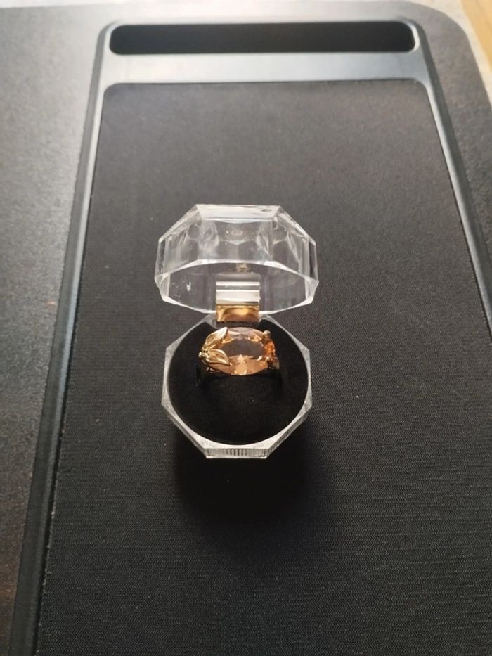 Bague en plaqué or sertie d'un zircon taille ovale à facettes couleur champagne. Taille 59 (19,5mm) Vendue neuve avec coffret