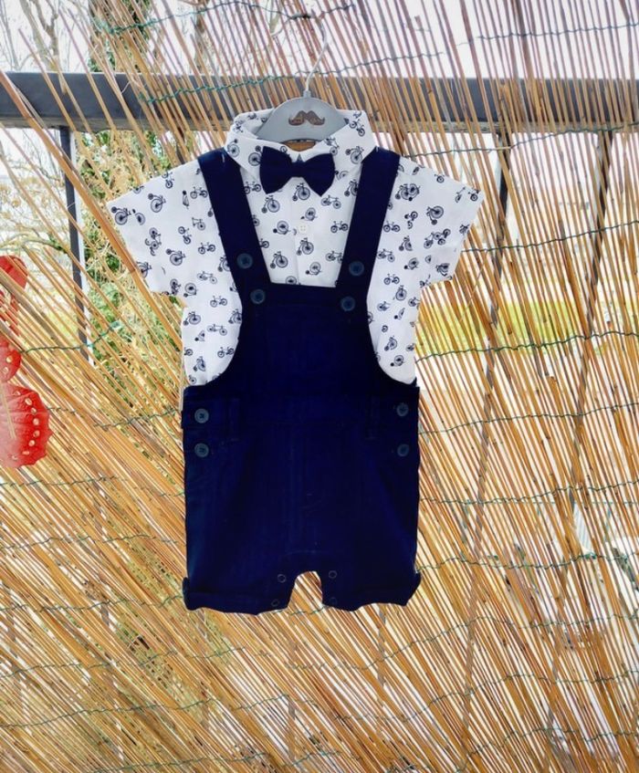 Ensemble bébé garçon avec : 1 salopette 1 chemise 1 noeud papillon Taille 3/6 mois. Neuf et sous emballage.