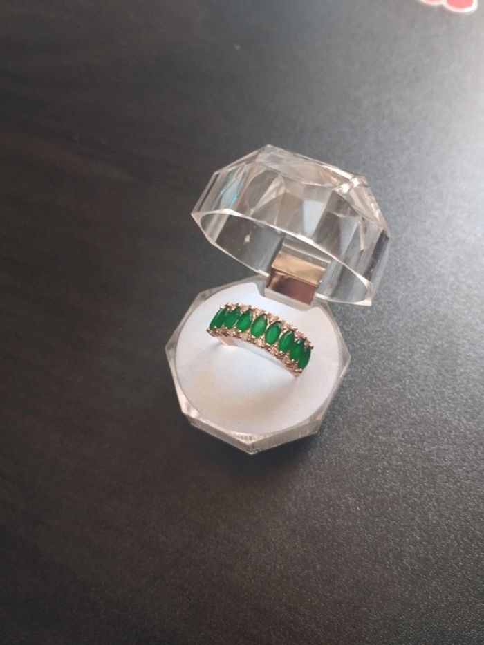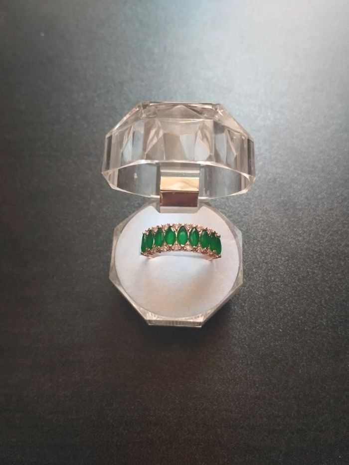 Anneau en plaqué or rose 585/1000e serti de zircons vert émeraude taille Marquise entourés de petits zircons blancs taille brillant. Taille 61 (20mm) Vendue neuve avec coffret