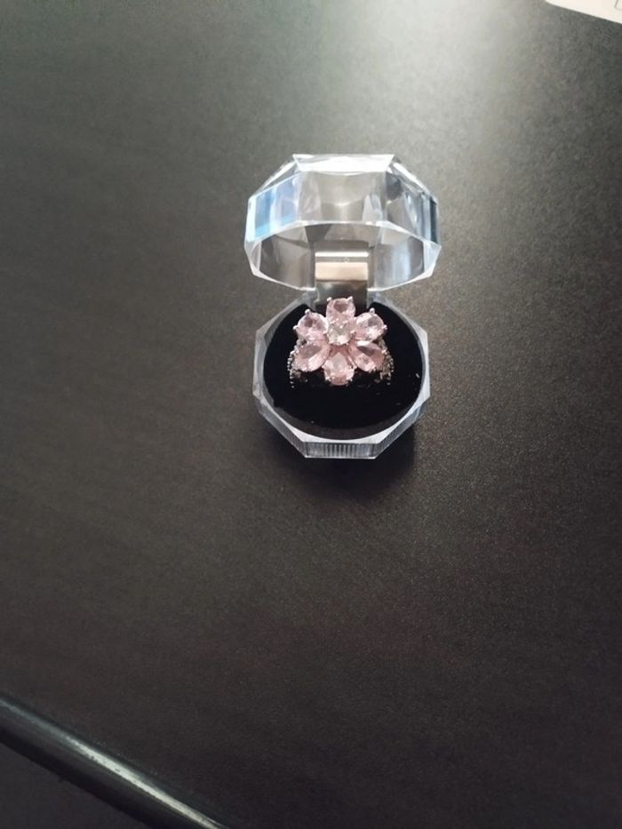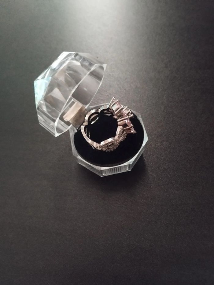 Bague en acier inoxydable sertie de zircons rose taille poire et brillant. Taille 59 (19,5mm) Vendue neuve avec coffret